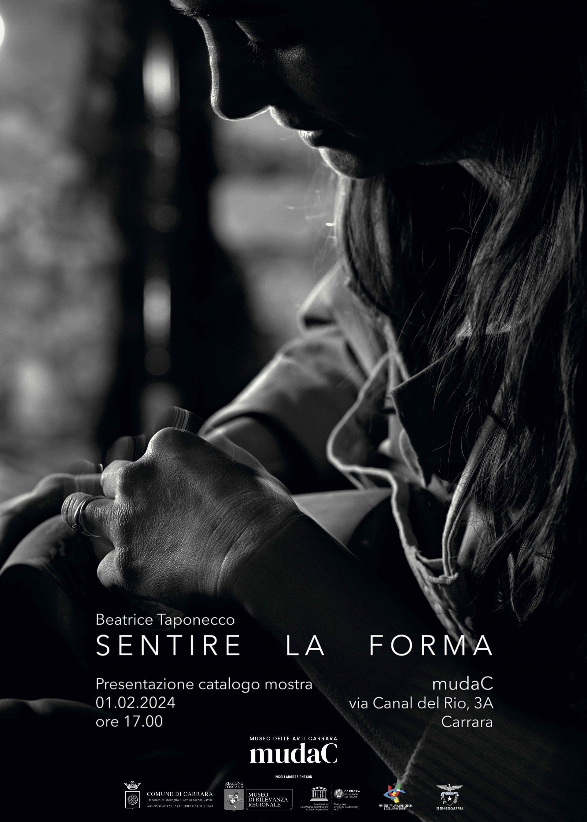 La mostra di Beatrice Taponecco è il risultato di un processo di co-progettazione del percorso espositivo realizzato dall’artista con la collaborazione di persone non vedenti. L’esperienza sensoriale fondata sui valori tattili e le sensazioni restituite dalla possibilità di toccare le sculture in marmo esposte in ambiente oscurato, hanno portato i visitatori ad una sperimentazione inusitata, amplificata dalle note del brano “Beatrice che scava la pietra” composta da Andrea Nicoli.