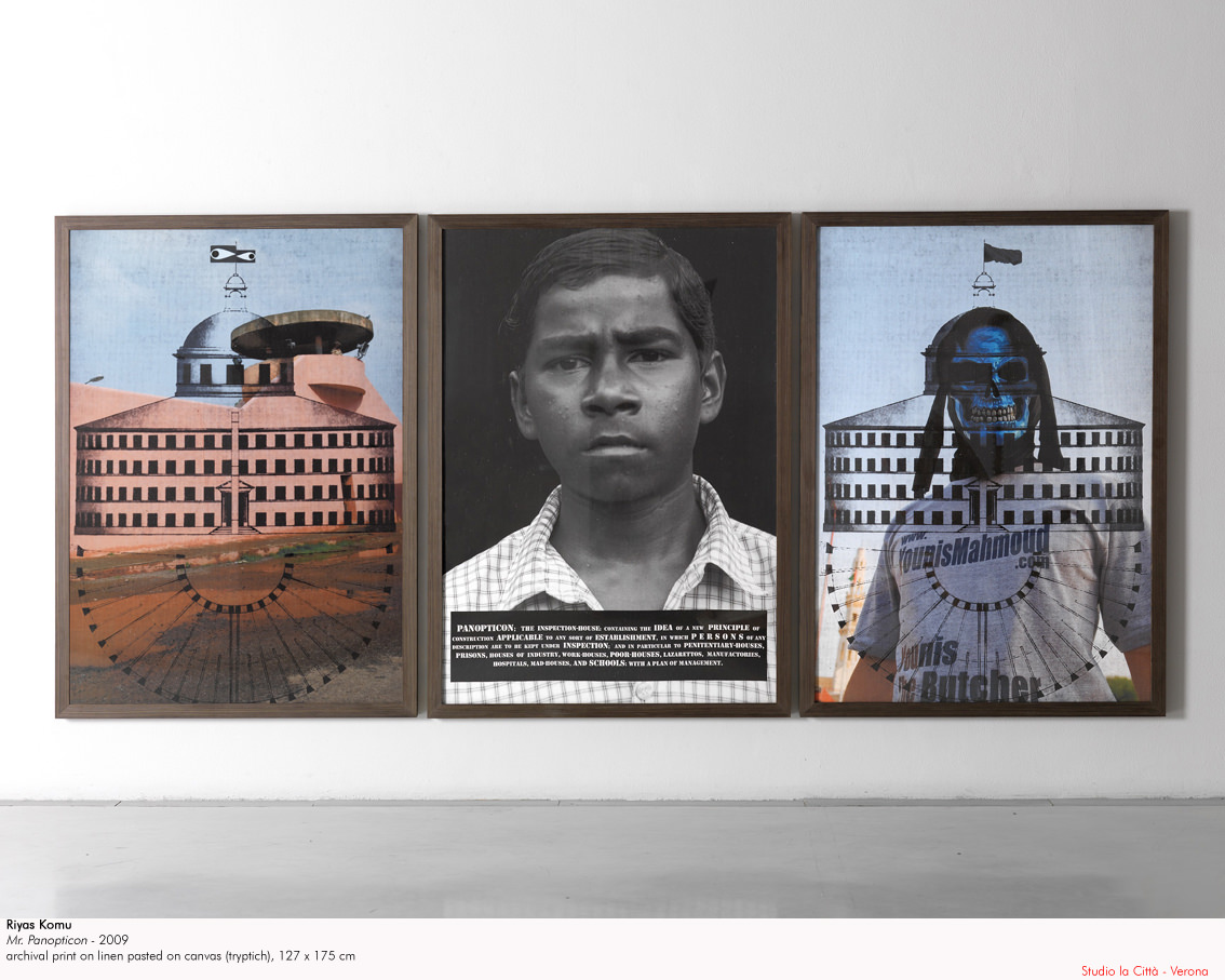 Valga per tutte l’opera di Riyas Komu (Kerala, India – 1971), “Mr. Panopticon”, 2009, un trittico che ben evidenzia l’aspirazione di quella edilizia carceraria, progettata a fine Settecento dal filosofo inglese Jeremy Benthan, volta al controllo permanente dell’individuo una volta inserito in un universo concentrazionario (scuola, esercito, fabbrica, carcere, ospedale che sia). Qui, nella struttura del Panopticon, la nozione di centro e quella di periferia non hanno più luogo, e proprio questo ci sembra essere il paradigma di quanto sta avvenendo, o è già avvenuto, nell’arte contemporanea a fronte di un’altra circolarità, quella della comunicazione, e dell’abolizione delle distanze geografiche.