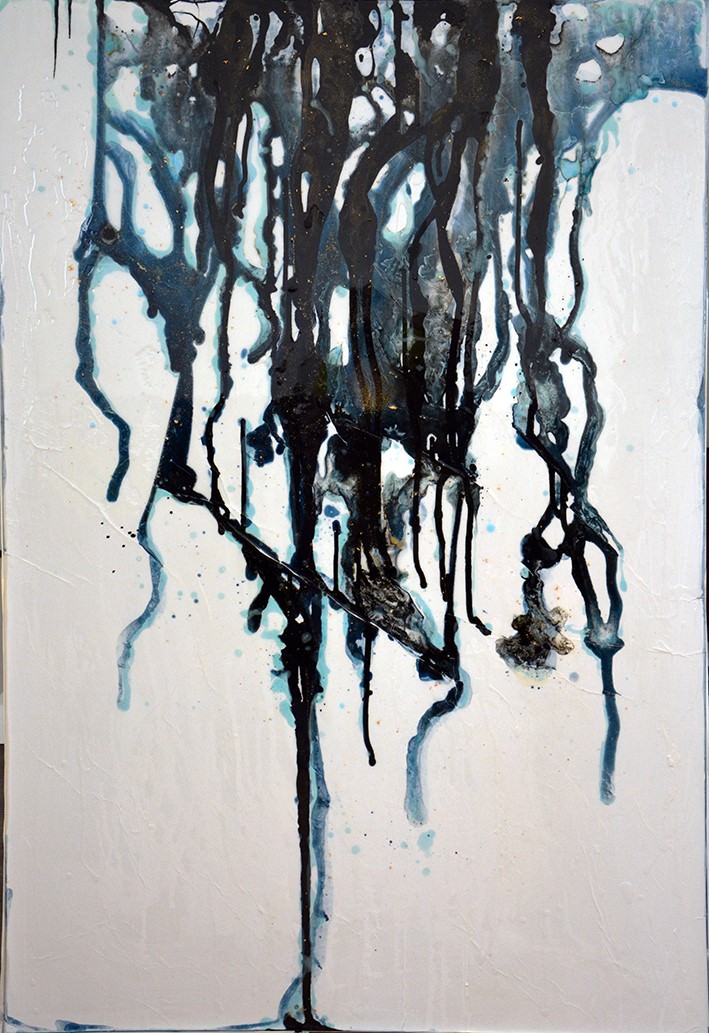 I corsi d’acqua cristallina, popolati da muse, si diramano sulla terra come le vene del corpo, ma l’acqua diventa oscura, adombrata per mano dell’uomo. Lo sguardo dell’artista si fa malinconico e severo e ci rammenta che gli spiriti della terra parlano all’umanità e la invitano a soffermarsi e riflettere. Un messaggio di profonda riflessione e di rispetto per una natura deturpata ma viva e meravigliosa.
