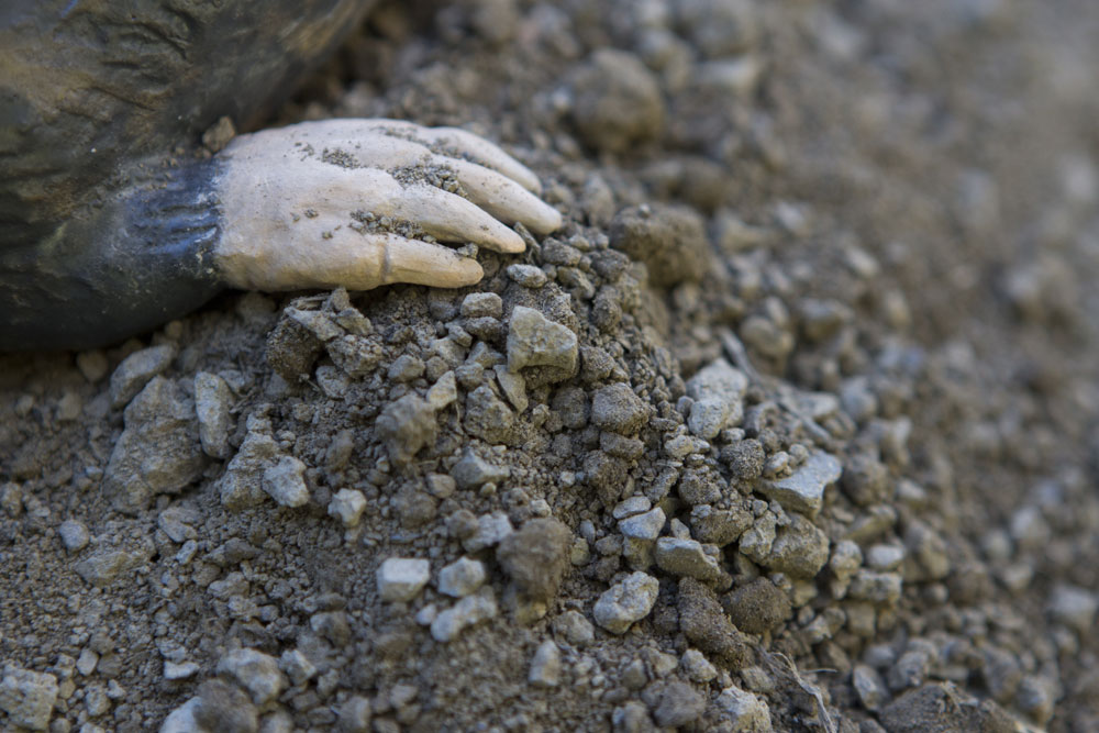 “Avrò avuto cinque, sei anni e un giorno mio nonno, mi portò a vedere una talpa morta sotto un colpo di zappa. Con fierezza appoggiò l’animaletto sul tavolo quasi fosse un trofeo. Il suo scopo era quello di “insegnarmi” che era un essere dannoso per il giardino e che di conseguenza, andava eliminato. La mia reazione, fu di prendere degli scampoli di stoffa con la quale assemblai una sorta di lettino ove riposi l’animale rimboccando “la coperta”. Pensavo ingenuamente che a quel modo, la talpa, sarebbe potuta “guarire” dalla morte e tornare viva nel verde giardino. Non pensavo esistesse la morte e nemmeno che la talpa fosse cieca. La talpa morta o dormiente, rimanda al ricordo, alla purezza infantile, la talpa è cieca, è ignara del danno che reca al giardino agli occhi dell’umano.” Così Serena Zanardi presenta il protagonista indiscusso di quest’immersione nel verde universo del giardino: la talpa. Simbolo dell’innocenza e dell’involontarietà̀ del ricordo, la talpa (numerose talpe) campeggia nell’installazione centrale della galleria, sul pavimento, in corrispondenza della cupola ottagonale. Riempita di terriccio, questa sorta di cromlech contemporaneo a otto facce crea un continuum tra terra e cielo, memoria passata e presente-futuro.