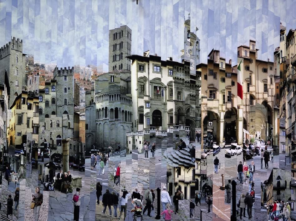 Next Art Gallery inaugura la propria stagione espositiva 2008-9 con una mostra che omaggia la città di Arezzo. Serge Mendjisky: Arezzo/Parigi/New-York origina dall’attenzione che l’artista francese ha dedicato alla città, qui venendo nel 2007 per effettuare numerosi rilievi fotografici necessari alla realizzazione di quella che, dal 5 settembre al 6 ottobre 2008, è l’opera principale dell’esposizione nei locali della chiesa dei Santi Lorentino e Pergentino. Il quadro raffigura Piazza Grande di Arezzo attraverso la particolare e nota tecnica usata dall’autore, definita foto-pittura. Con particolare abilità e sapiente ricostruzione delle sezioni di foto, l’artista riesce a portare innanzi all’osservatore tutti i lati della piazza, le sfaccettature degli edifici, il vivace viavai della gente e, soprattutto, l’austera prospettiva, frontale e di profondità, del portico vasariano. Insieme all’opera-omaggio, ve ne sono altre riguardanti i soggetti classici del lavoro di Mendjisky, ossia le città (di Parigi e di New York): a manifestare con quanta efficacia l’intuizione dell’autore riesca nel rappresentare la vitalità delle vecchie e delle nuove architetture.