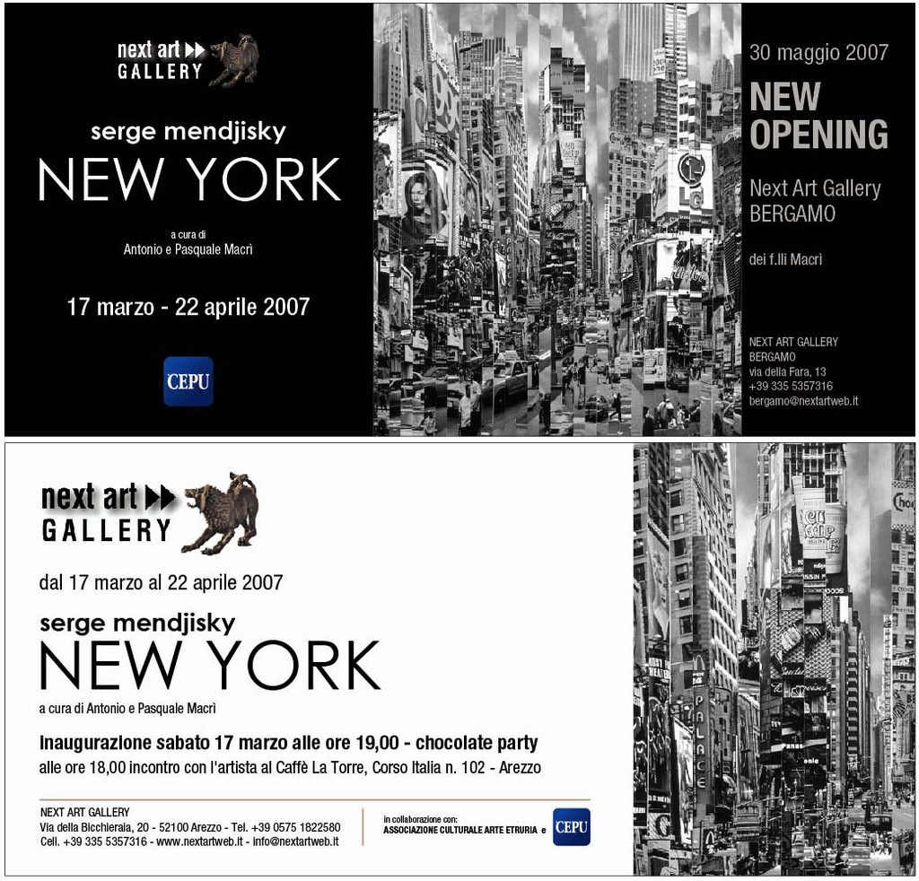 La mostra (che sarà anche visibile nella prossima nuova sede di Next Art a Bergamo a partire dal 30 maggio) prevede un incontro preliminare al CAFFE' La TORRE, in C.so Italia, alle h.18,00 con i curatori e Matilde Puleo per proseguire l’abitudine di fare due chiacchiere sul contemporaneo tramite lo spunto offerto dal lavoro dell’artista. Nel campo della fotografia Mendjisky (che sarà presente all'evento) ha partecipato alle più importanti mostre d’arte organizzate in territorio francese manifestando la sua capacità di esulare dalla banale documentazione. L’intento delle sue immagini è orientato a rintracciare un collegamento possibile tra ciò che è tratto dalla realtà e la sua scomposizione spazio-temporale, coinvolgendo in questa ricerca megalopoli come New York. Quella di Mendjisky è una variante dei collages oltre che un’altra versione della fotografia. I suoi fotomontaggi utilizzano un materiale che intrattiene un rapporto particolare con la realtà e il mondo dell’arte. Si tratta dell’invenzione di uno spazio frammentato in tempi diversi e creato dal soggetto stesso, intenzionato a sciogliersi in una pioggia di linee in cui oggetti e spazio si fondono simultaneamente. Ciò che conta non è il singolo momento ma la sua struttura interna. Smontare e rimontare i dati per ricostruire in altro modo e far vedere quello che non c’era prima è l’imperativo categorico di una tecnica costituita da un dedalo di varianti ma che ricorda il gioco di specchi. Alla fine siamo spinti a chiederci se Broadway i grattacieli di Manhattan e gli altri oggetti urbani siano stati catturati in una qualsiasi delle dimensioni temporali oppure se non appartengano ad una dimensione a noi ignota. Esploso sull’orbita dello spazio-tempo, il reale diventa un segno in grado di attraversare il tempo dell’oggetto, rendendoci incapaci di collocarlo in un passato possibile oppure in un futuro sconosciuto.