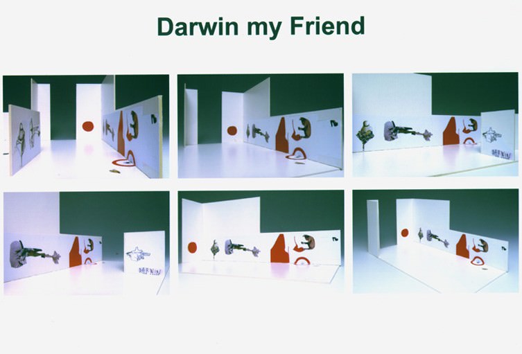 L’installazione Darwin my Friend, è stata appositamente ideata dall’artista danese, ma di origine ucraina, Sergei Sviatchenko per la Galleria Arturarte. Si tratta di una sorta di collages fuori scala arricchito da alcuni wall-drawing. È la narrazione figurata dell’apprendistato emotivo dell’autore, condotta lungo il filo del ricordo, ma senza struggimenti elegiaci. Come dice Maurizio Coccia nel catalogo: “Si procede per figurazioni allusive. Grandi rappresentazioni che si susseguono a ritmo discontinuo. Forme geometriche dal cromatismo piatto. Scampoli fotografici come ritagli imprecisi di gigantesche riviste. E su tutto, dietro a tutto, il coagulo minaccioso della dominante rossa.” Il perimetro della galleria diventa così, il teatro della memoria dove si rappresenta, per flashback, il passaggio di consegne di una sofferta esperienza personale, scandito dai paradigmi darwiniani di Variabilità, Eredità, Segregazione Naturale.