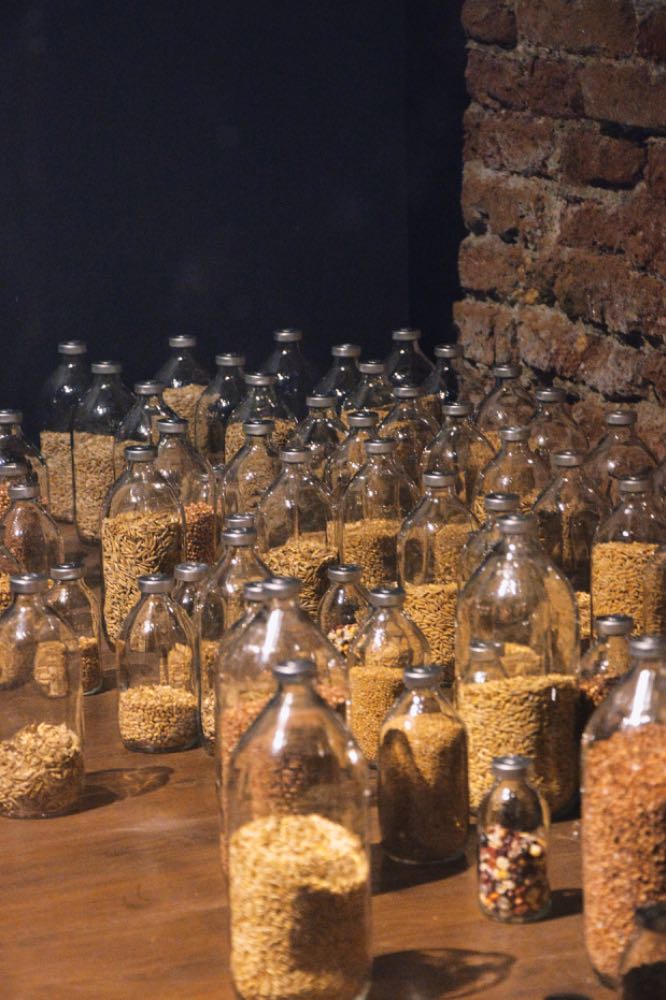 La serie Pane quotidiano (2014) è invece dedicata al salvataggio della collezione genetica raccolta da Nikolaj Vavilov (alcuni suoi collaboratori preferirono morire di fame, durante l’assedio di Leningrado, piuttosto che intaccarla). Sono dittici accostati. La parte sinistra è un documento, la fotografia di un erbario di cereali salvati durante l’assedio (un foglio direttamente di mano dello stesso Vavilov). Il lato destro è un’incisione che rispecchia il documento in uno strato di cenere: da un lato emblema delle infinite tragedie umane della storia del pianeta; dall’altro, nei nodi degli steli delle piante, metafora di destini umani spezzati, distrutti dalla repressione e dalla guerra. La sezione presenta anche l’installazione Banca genetica, in cui bottiglie mediche contenenti soluzioni invasive e sostituti del sangue sono riempite con semi di cereali, come nella collezione conservata all’istituto di Vavilov nel Kuban, per comunicare che «i chicchi di cereali sono il sangue per l’umanità», senza il quale l’umanità non può esistere.