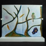 L’esposizione comprende otto libri d’artista sul tema degli uccelli, ognuno arricchito da acquerelli in formato 30x120 cm., firmati dagli autori, ripiegati a fisarmonica e preceduti da un breve testo poetico. I volumi, rilegati a leporello con copertine di tessuto giapponese vintage, saranno esposti su un leggio sonoro che riprodurrà brani e composizioni musicali riferiti al canto degli uccelli.
