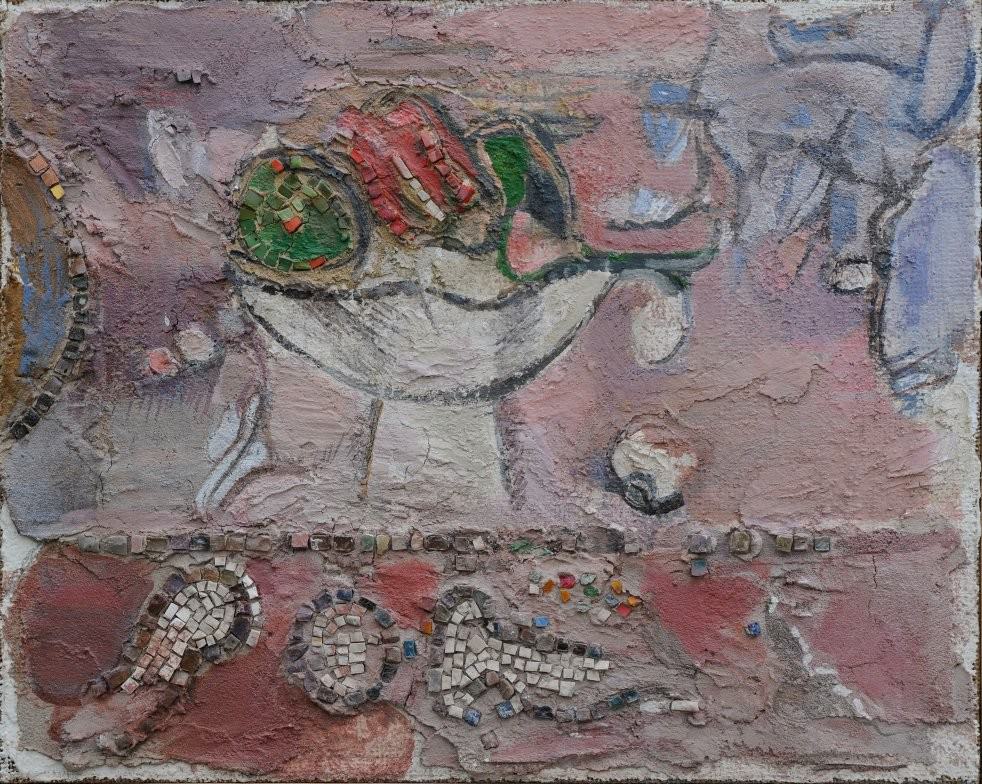 La serie delle nature morte selezionate per la mostra, sono esemplari di questa modalità del fare che alterna, nella stessa opera, interventi ben definiti e definitivi, come sono le parti a mosaico, avvicinati a lacerti pittorici dilavati,abrasi,quasi cancellati,per conservare soltanto la traccia…
