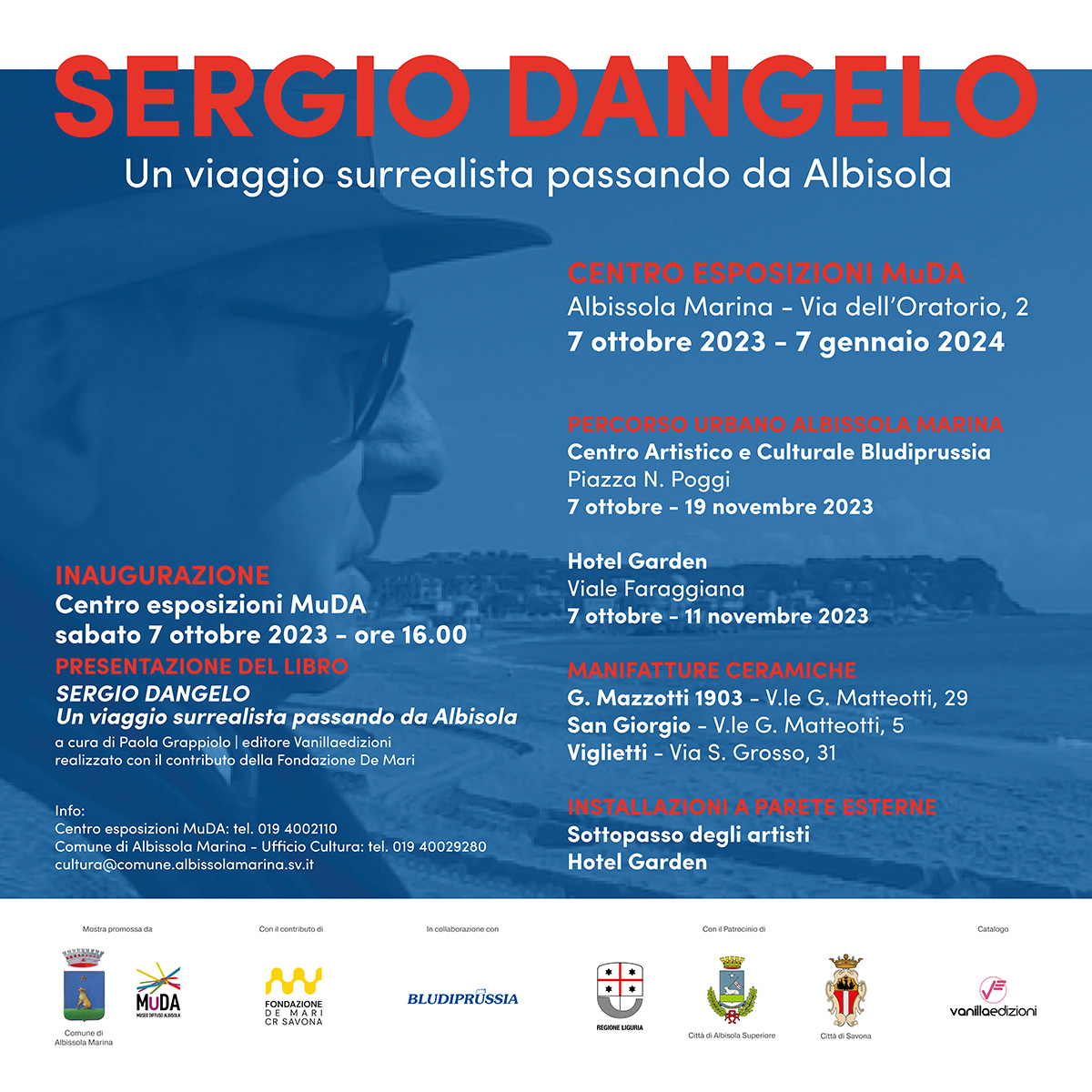 La presentazione del libro e l’inaugurazione della mostra saranno sabato 7 ottobre 2023 (ore 16.00) e l’esposizione terminerà domenica 7 gennaio 2024. L’evento si sviluppa con un allestimento all’interno del Centro Esposizioni MuDA (Museo Diffuso Albisola) e nel territorio di Albissola Marina con un percorso nelle gallerie (Centro Bludiprussia), nelle fornaci (manifatture: Viglietti, San Giorgio, G. Mazzotti 1903), frequentate nel tempo dall’artista, nei luoghi pubblici (sottopasso di Albissola) e privati che conservano le sue opere (Hotel Garden).