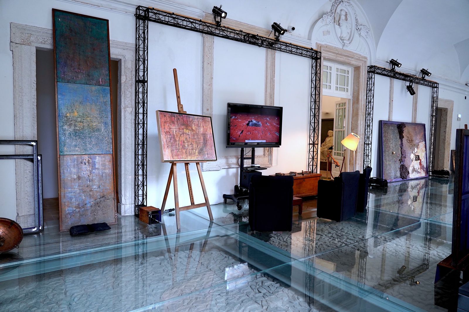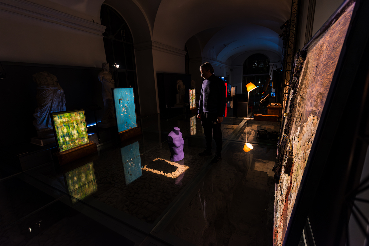 Il cuore del progetto è la serie di opere Organismi Artistici Comunicanti, pitture-sculture 'vive' realizzate con pigmenti organici e metallici in continua mutazione: foglie d'oro, intonaci, ferro ossidato, garza, vetro, cemento, cera. Materiali che danno corpo alla fragilità e all'effimero, generando opere che si trasformano nel tempo, aprendo ferite e crepe che interagiscono con l'ambiente. Un'eredità di maestri come Munch o Yves Klein, ma declinata in un'estetica che fa della vulnerabilità una forza rigenerativa. Affiancate a queste opere, le fotografie della serie Terre Rare indagano le tracce dell'umanità in luoghi abbandonati, rivelando la bellezza nascosta nelle superfici scalfite e nelle ombre impresse dal tempo, trasformando celle e scritte sui muri in narrazioni vive di esistenze passate.