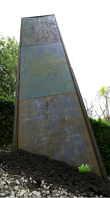 Uno degli elementi più innovativi e sperimentali dell'esposizione è stata l'installazione di ‘Organismi Artistici Comunicanti’, opere che rompono con i canoni classici dell'esposizione museale. Questi dispositivi artistici sono stati conficcati direttamente nel terreno del giardino, come se, caduti dal cielo, fossero diventati parte integrante del paesaggio stesso. Radicati nella natura, interagivano con essa, mostrando la lenta trasformazione che il tempo e gli agenti atmosferici imprimono sulle superfici delle opere. Le pitture-sculture, già segnate dalla vulnerabilità dei pigmenti organici e metallici che le compongono, sono state ulteriormente plasmate dalle intemperie, permettendo che piante e muschi si insinuassero tra le loro trame. Quasi a voler suggerire che, proprio nella fragilità, si cela il potenziale per generare nuova vita.