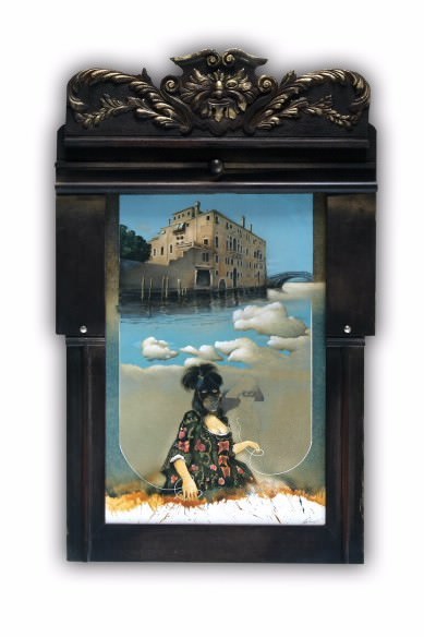 L’anima teatrale dell’artista conduce Saccomandi a non voler raccontare compiutamente la Serenissima, ma come sul palco di un teatro, recitare un penetrante monologo, proporre brandelli di incontri in surreali ed onirici interni di settecentesche abitazioni come a originare scenografie teatrali. Gran parte delle opere esposte vengono infatti presentate come veri e propri “teatrini” in cui il boccascena diventa elemento portante e determinante della sequenza delle composizioni, inquadratura e cornice di un itinerario che si snoda come in una serie di atti unici.