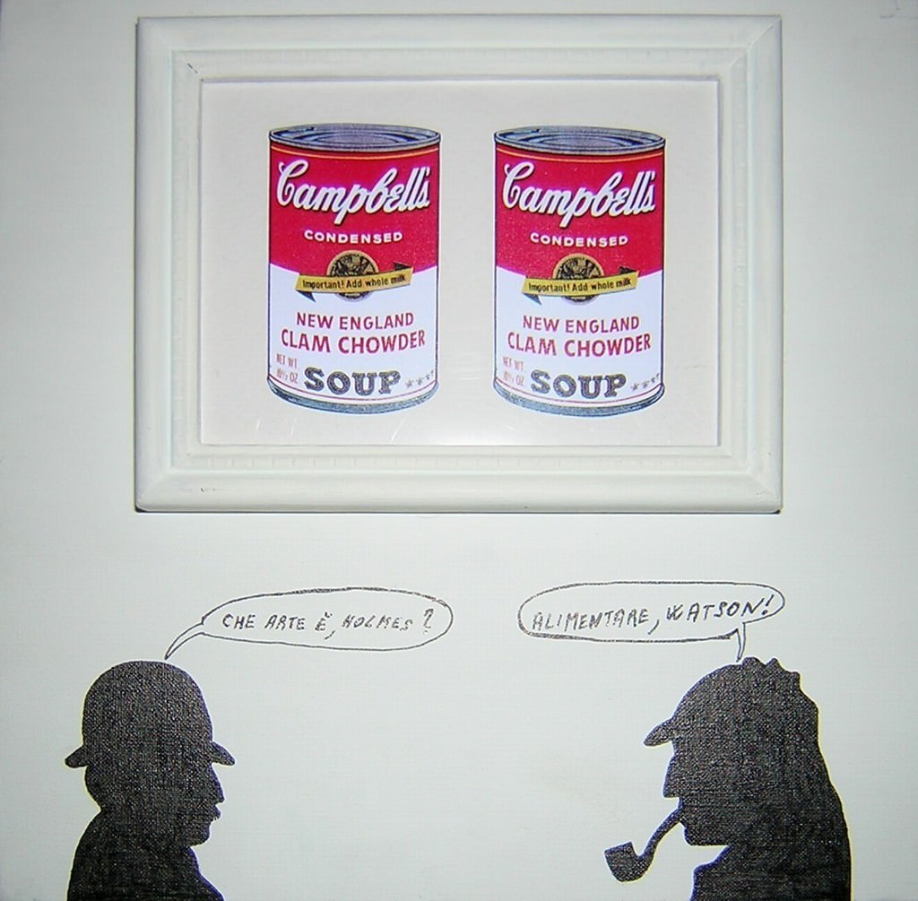 In piccole tele, Sergio Vanni ripercorre la storia dell’arte, da Leonardo Da Vinci a Cattelan, usando le immagini più famose o popolari, coniugandole con giochi linguistici che stravolgono il titolo, il nome dell’autore o correlandole di battute ironiche