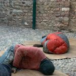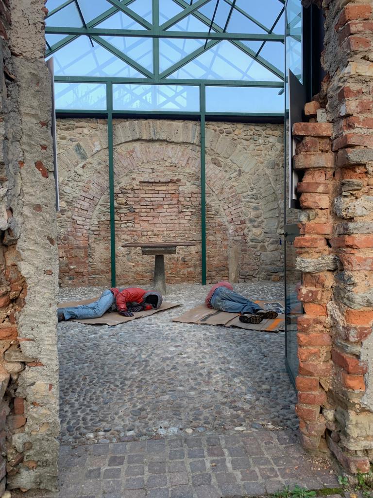 Gli homeless sono esoscheletri deposti sulla risacca urbana. Installazione artistica di Sergio Zagallo