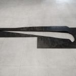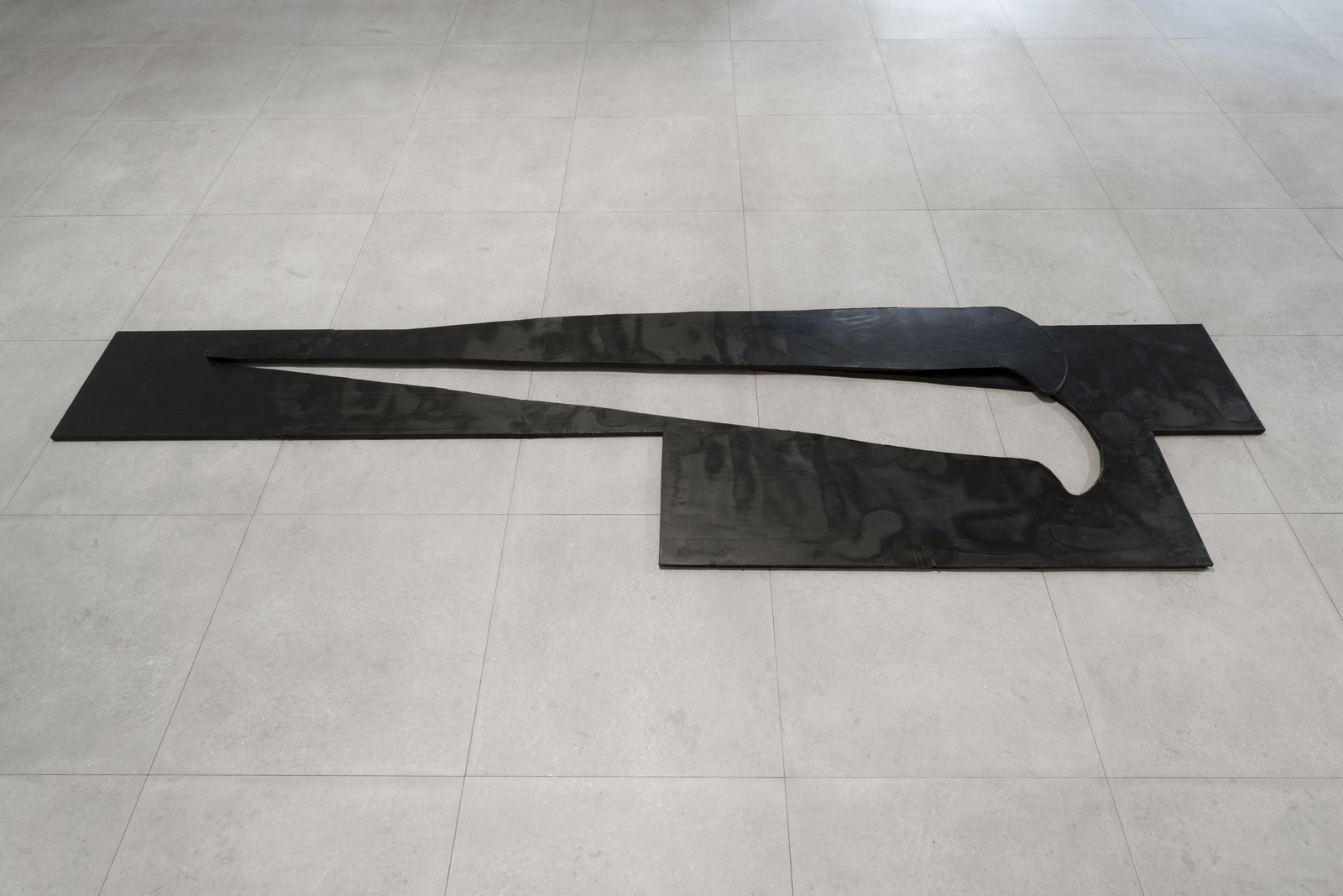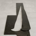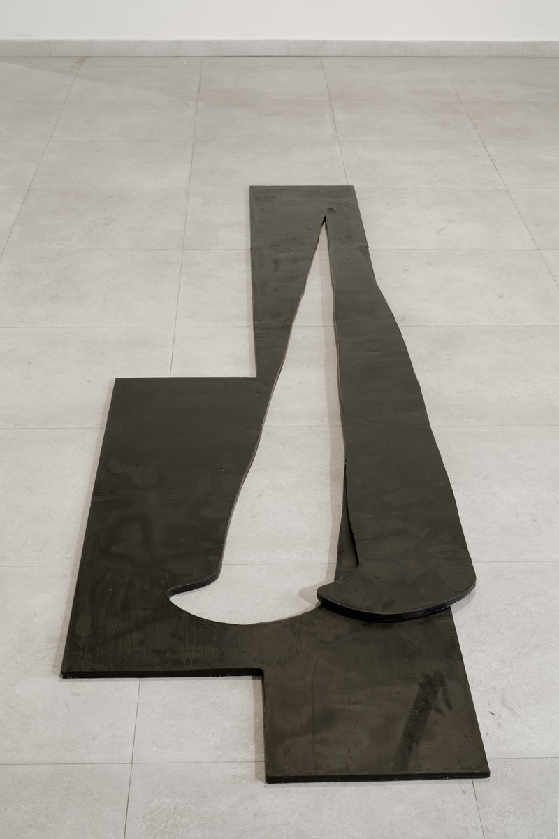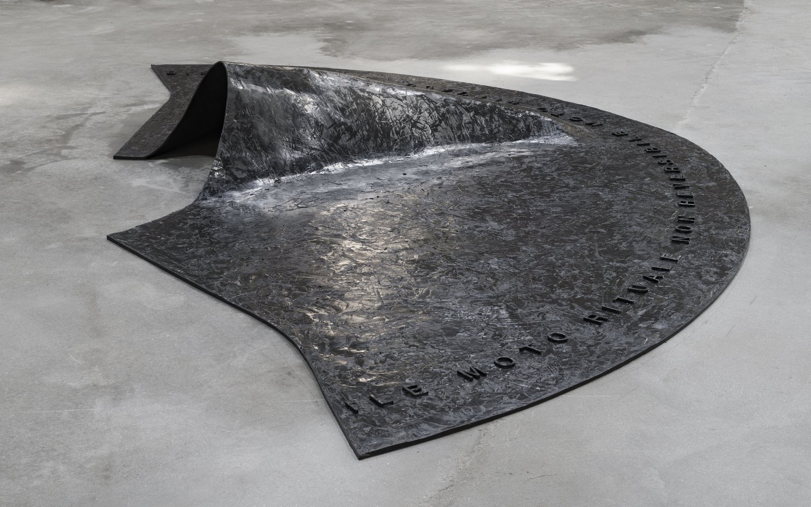 Partendo da una grande scultura in cera nera di fonderia, distesa a pavimento a circoscrivere un territorio delimitato, visibile dall’alto nei suoi frazionamenti che obbligano ad un percorso periferico e costrittivo, l’azione nel paesaggio si compie passando alle sale successive, dove le grottesche e il ciclo pittorico di ispirazione raffaellesca, dedicato al mito di Apuleio su Amore e Psiche, si alterna agli affreschi di paesaggi e insediamenti militari concepiti per orientarsi nel territorio. Qui Serj appone un segno, un grande scettro-vessillo, prezioso e sinistro nella sua imponenza, agìto attraverso una performance evocativa che vediamo immortalata nello scatto fotografico di uno sbandieramento da parte dell’artista. Questa azione, intesa come rievocazione e potenziamento simbolico del rito, produce il successivo salto evolutivo nello spazio, l’accesso ad una struttura iperbolica, attraversabile, connotata dalle sue volute plastiche che piegano lo spazio cartesiano in spazio quadridimensionale.