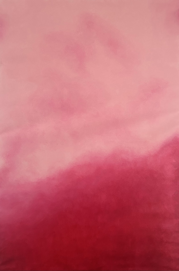 Gli oli dai caldi colori che l’artista mutua dallo spettro solare, sono stesi sulla tela come veli trasparenti che vanno ricoprendo il supporto materico che ha la sola funzione di renderli visibili. La composizione armoniosa dei colori, disegna nuvole leggere che aleggiano come serafini danzanti, rivelando la natura immutabile ed eterna dei cieli che, non curanti del tempo, dello spazio e degli uomini, rinascono ogni giorno uguali a sé stessi nella loro poetica bellezza.