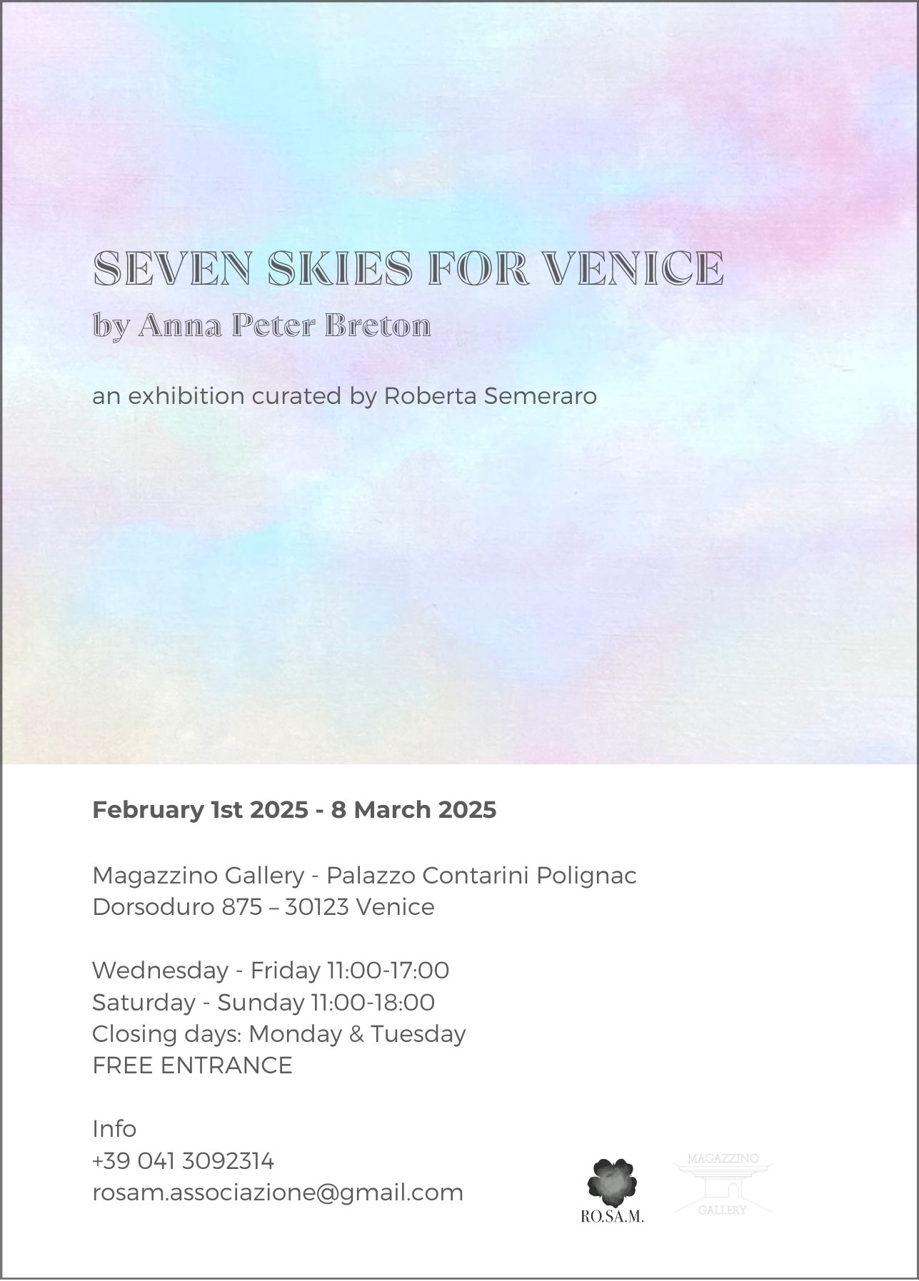 L’Associazione ROSAM è lieta di presentare SEVEN SKIES FOR VENICE, una mostra personale dell'artista Anna Peter Breton, aperta al pubblico dal 1 febbraio all’8 marzo 2025. Un viaggio artistico nelle teorie tolemaiche-aristoteliche delle sette sfere celesti, dove spiritualità e bellezza s’intrecciano nei Cieli sospesi sopra Venezia e i laghi sacri del Kirghizistan.