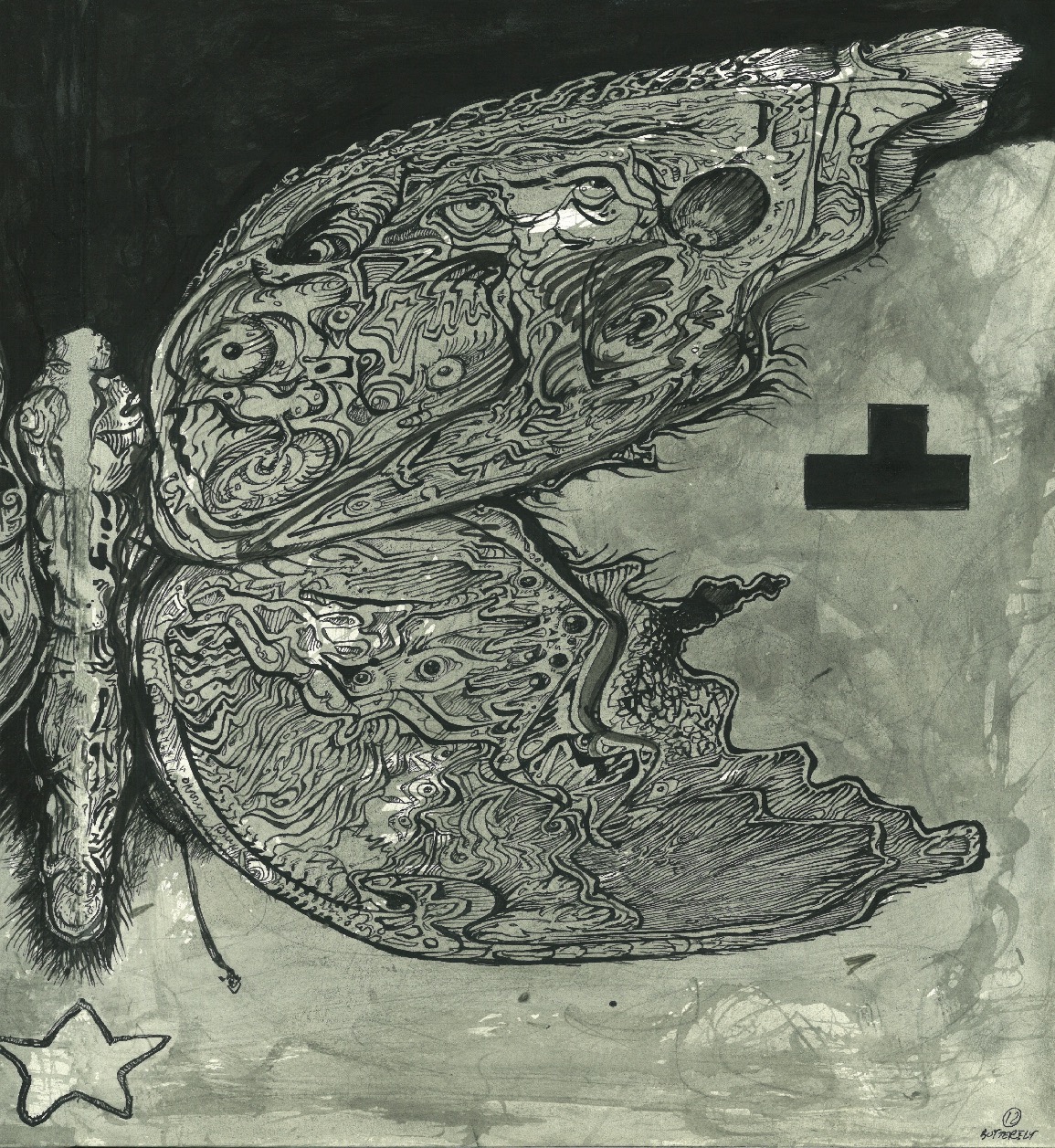 L’artista realizza opere a china su carta, prediligendo il nero, integrando talvolta il rosso per dettagli.