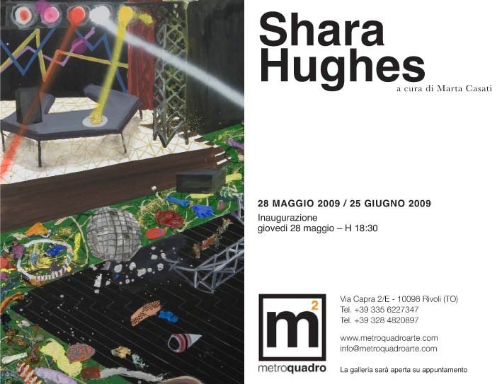 In mostra una selezione di opere realizzate nel 2008 con dieci opere miste su carta di piccolo e medio formato e tre opere olio su tela di grande dimensione. “Gli ambienti di Hughes non assomigliano o ricordano immagini fotografiche estrapolate da riviste d’arredamento”, scrive Marta Casati nel testo critico in catalogo, “La concatenazione degli eventi strutturali si somma elemento con elemento fino unirsi in una struttura completa, circolare, quasi gestita da una visuale privilegiata elargita a 360°. E’ come se all’occhio dello spettatore fosse dato il potere di incamerare nel foro stenopeico del suo apparato oculare la completezza della prospettiva che ha di fronte”. Il mio processo pittorico si basa su una spontaneità controllata. A volte pianifico l’intero dipinto prima di cominciare e tutto procede senza intralci. Questo tuttavia avviene di rado dato che non so mai esattamente cosa succederà. Altre volte mi succede di avere un’idea o un oggetto specifico dal quale iniziare. Potrebbe trattarsi di una parete, di un dipinto, di una sedia o di una combinazione particolare. In questo modo il resto del dipinto gira intorno a quel particolare, ha spiegato Shara Hughes durante l’intervista.