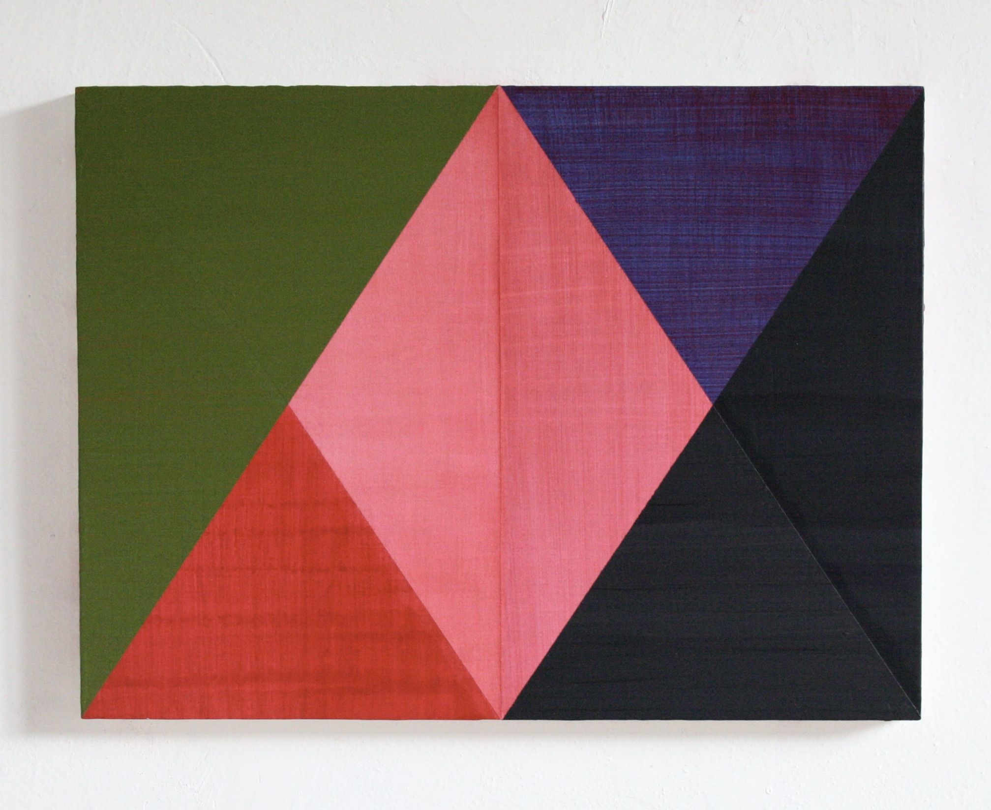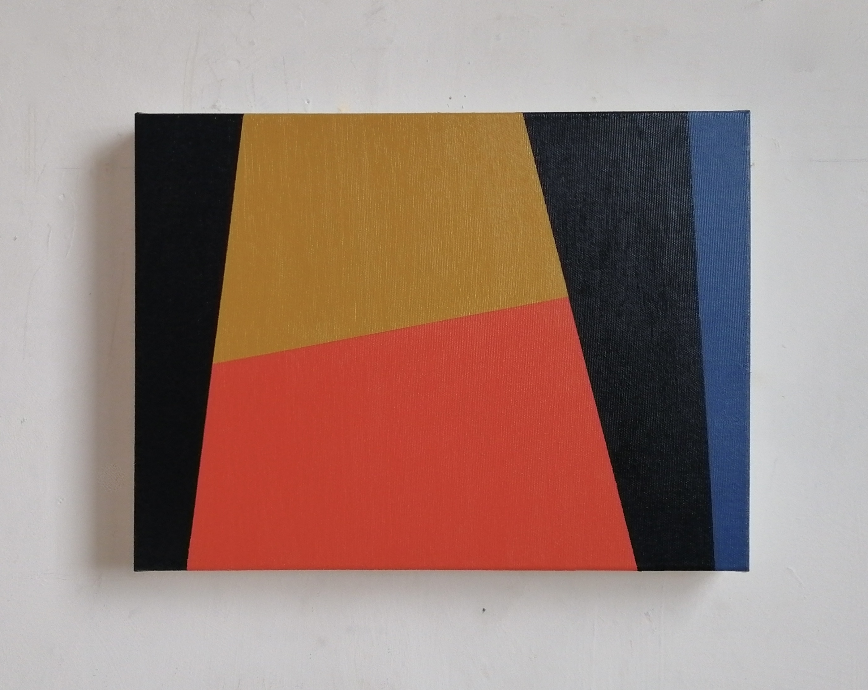 Pittura astratta di concezione geometrica, potremmo definire così la pratica artistica di Sharon Hall. Ma questa etichetta non riesce a rendere pienamente i risultati a cui arriva la pittrice inglese. I suoi quadri infatti sono dotati di una freschezza unica. Se l'intenzione di partenza è quella di costruire opere in cui la divisione degli spazi è regolata in modo esatto e razionale, l'esito finale sorprende perché possiede una affascinante morbidezza visiva, evidente quando si guardano le sue opere non sullo schermo di un computer, ma dal vivo, quando è possibile assaporare la concretezza vellutata dei colori, sempre accostati con la massima accuratezza: occupano settori monocromi contigui e dialogano fra loro intensamente.
