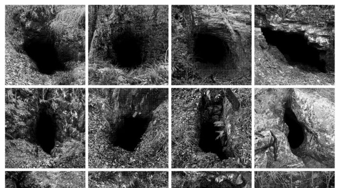 La struttura del libro, concepito come una griglia di 18 pattern quadrati, corrispondenti al nucleo di foibe studiate, è il cuore dell’esposizione, spazializzato e proiettato nell’ambiente per mezzo di testi, elaborazioni grafiche, lightbox, stampe fotografiche o serigrafiche su diversi materiali, fino a un breve video ipnotico realizzato per l’occasione, nuovo tassello di un iter aperto e complesso.