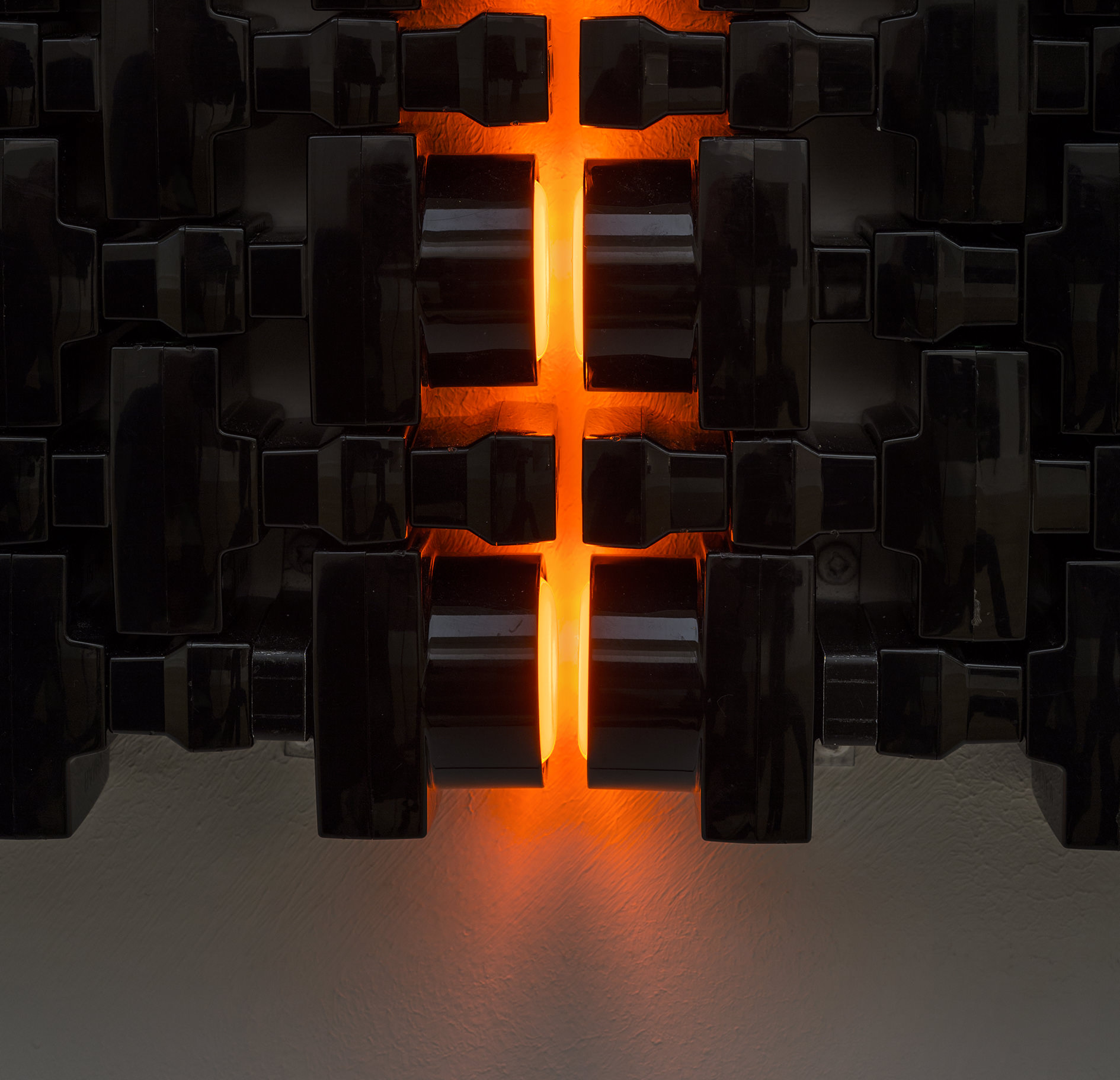 L'asettico componente industriale è imbrigliato all'interno di ripetizioni modulari e trasformato dall'elettricità in una forma viva, pulsante. Il passaggio dell'elettricità attraverso i moduli che compongono l'opera, genera un campo elettromagnetico che si diffonde nello spazio circostante, trasformando questi costrutti in generatori di energia, campi elettrici che si estendono nello spazio diffondendo la loro carica.