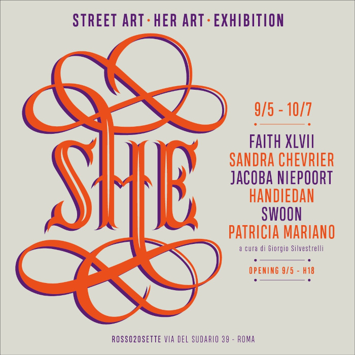 Sabato 9 maggio 2026 alle ore 18.00, Rosso20sette arte contemporanea presenta la mostra SHE Street (Art) - Her (Art) - Exhibition con le opere di Swoon, Patricia Mariano, Handiedan Sandra Chevrier, Faith XLVII, Jacoba Niepoort, a cura di Giorgio Silvestrelli: una collettiva che vuole celebrare le donne attraverso la lente della street art e dell’arte urbana con lavori su carta e su tela, alcuni mai esposti prima, altri realizzati appositamente.