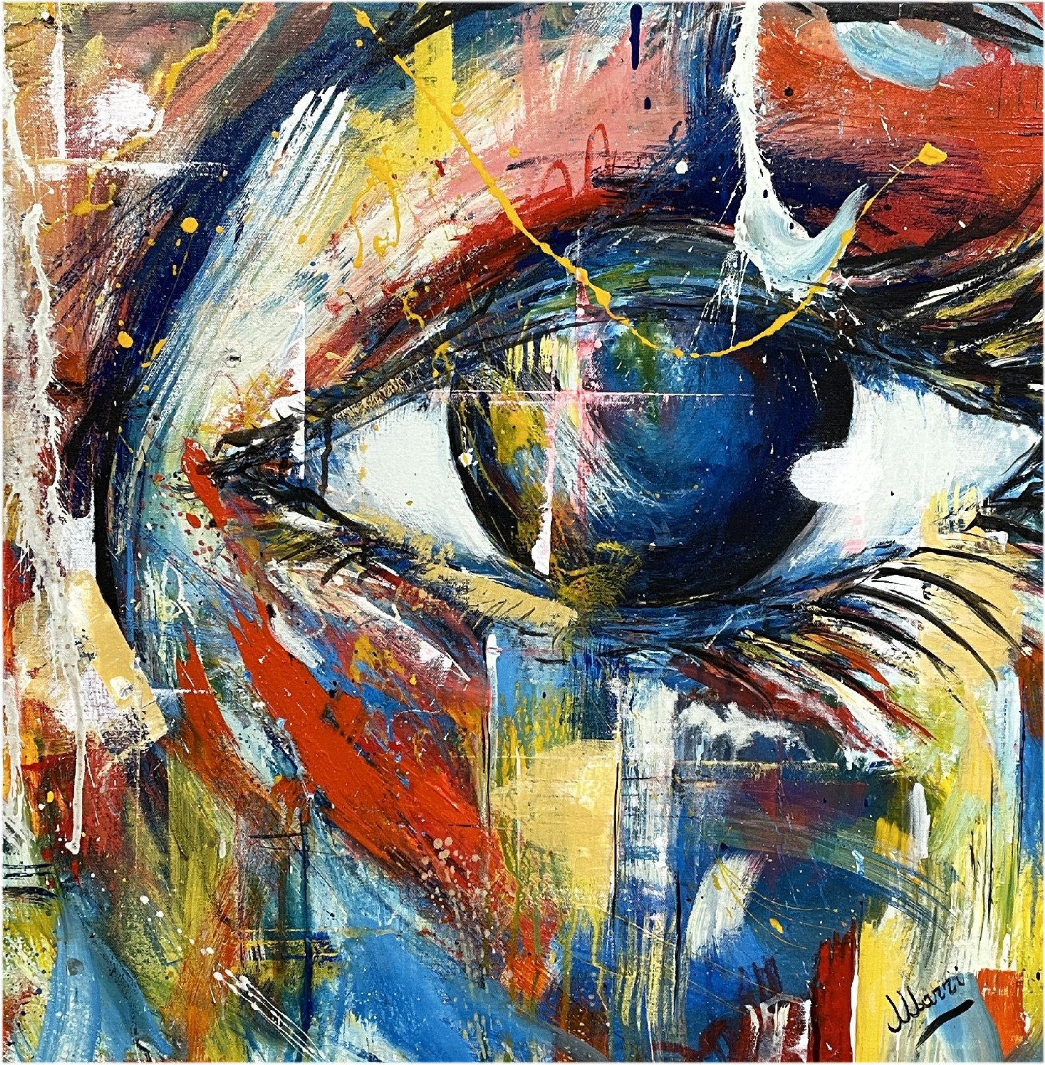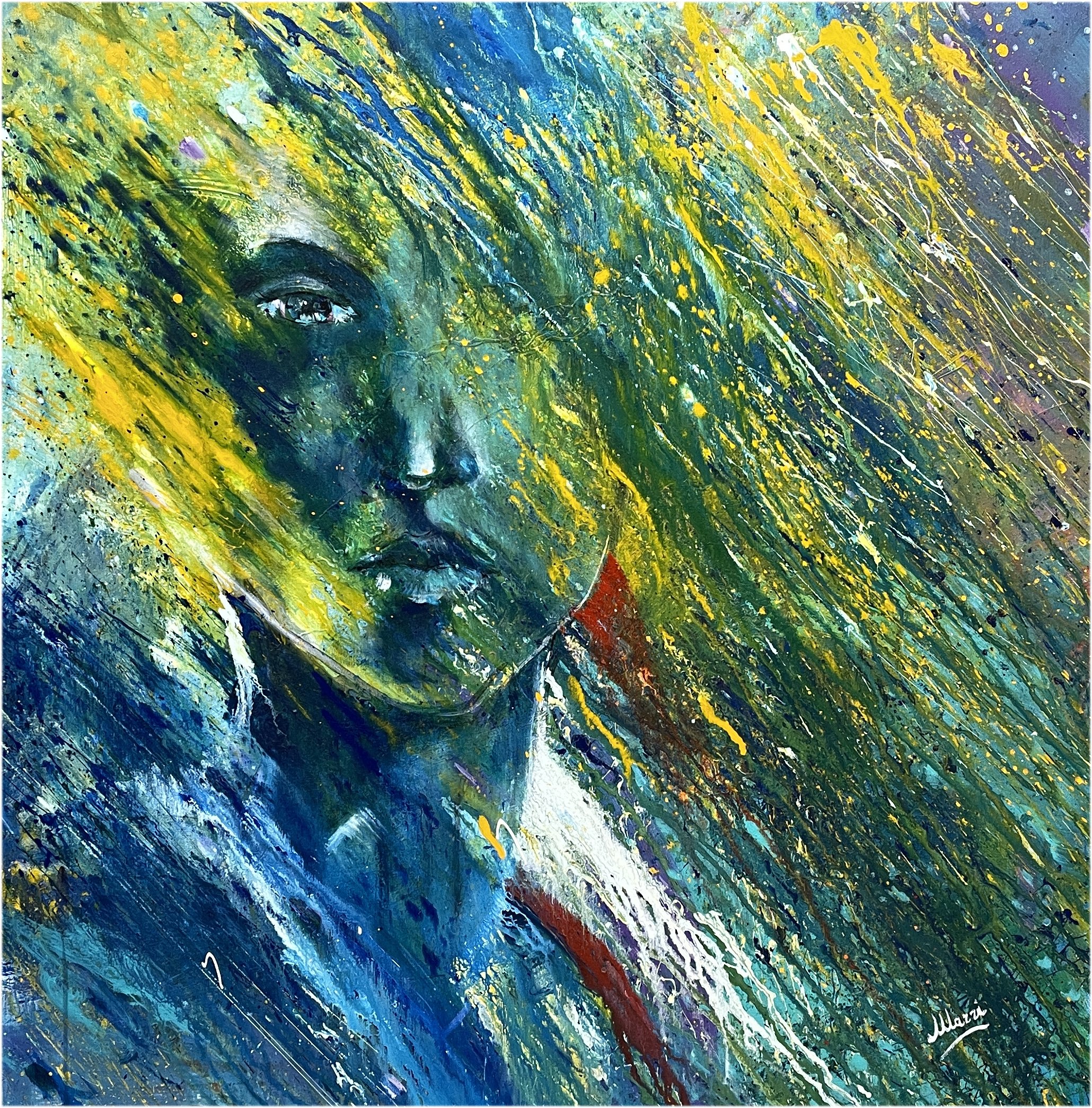 “She’s a rainbow” propone un punto di vista nuovo sulle emozioni dell’universo femminile con volti, sguardi, sentimenti che Marri riesce a cogliere in mille attimi della vita della donna contemporanea. La nuova serie è il frutto di un lungo periodo durante il quale l’artista di Alatri è passato attraverso lo studio di nuove forme espressive come per esempio l’acquerello, per poi tornare e consolidare il suo primo amore: una tecnica mista basata su acrilico e smalto su tela.