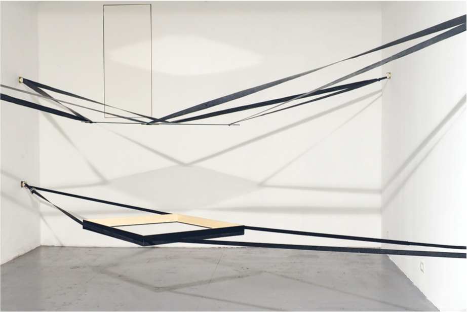 Nella prima sala della galleria pende sospesa in tensione l’installazione site specific Half Visible Revolution, che è a sua volta contraddistinta da un desiderio di casualità. Si tratta di una grande composizione di pannelli di compensato disposti lungo i muri della galleria, collegati alla parete opposta da cinghie di gomma elastica, allungate e rivestite di pigmenti, pronte per essere rilasciate e per seguire il loro imprevedibile percorso. Gli impatti subiti dai pannelli creano disegni sorpren- dentemente complessi rispetto a ciò che il nostro occhio riesce a catturare in un’azione per noi troppo rapida. Il punto di partenza del processo di stampa ha portato Pierre-Etienne Morelle ad estendere la sua ricerca a medium ausiliari della pittura. Esplorando la qualità della luce e dell’om- bra, sperimentando le linee e la composizione attraverso il proprio vocabolario, nella sala principale della galleria vengono presentate un gruppo di opere realizzate negli ultimi due anni. Le Etoile d’A- raingée sono un’ulteriore testimonianza della bellezza che si trova in fenomeni inaspettati che non possiamo controllare. I cocci di vetro sono stati accuratamente raccolti, riassemblati e incollati al laser, e il vetro rotto è diventato il supporto per un disegno creato all’ombra delle crepe.