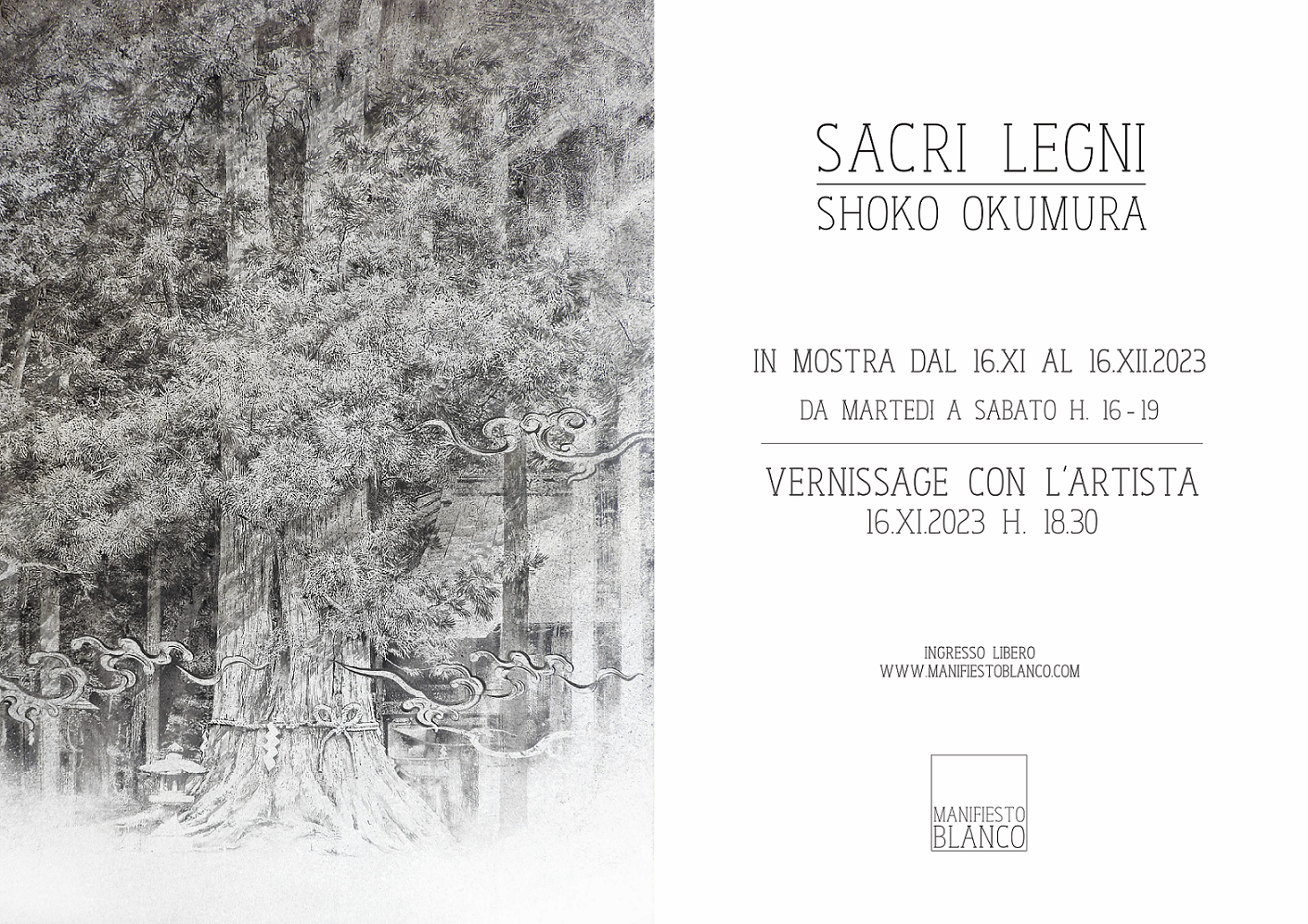Il progetto artistico Sacri Legni segna il graditissimo ritorno dell’artista giapponese Shoko Okumura alla galleria Manifesto Blanco, dopo la sua personale del 2020, Finestre di luce nei boschi.