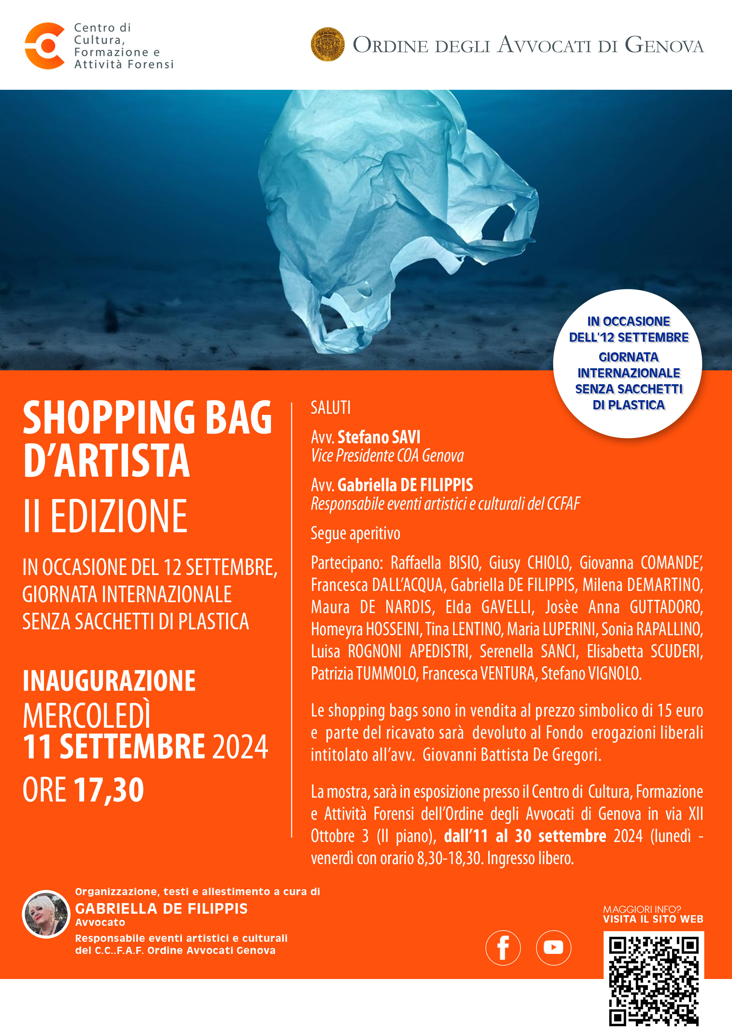 In occasione del 12 settembre, Giornata internazionale senza sacchetti di plastica, mercoledì 11 settembre 2024, alle ore 17,30, nei locali del Centro Cultura Formazione e Attività Forensi, in via XII ottobre 3, sarà inaugurata la II edizione della mostra SHOPPING BAG D’ARTISTA, alla quale hanno preso parte 19 artisti, che hanno dipinto, decorato o ricamato circa 25 shopping bags di tela e che saranno messe in vendita al prezzo simbolico di 15 euro ciascuna. Parte del ricavato sarà poi devoluto al Fondo di solidarietà di erogazioni liberali intitolato all’avv. Giovanni Battista De Gregori.
