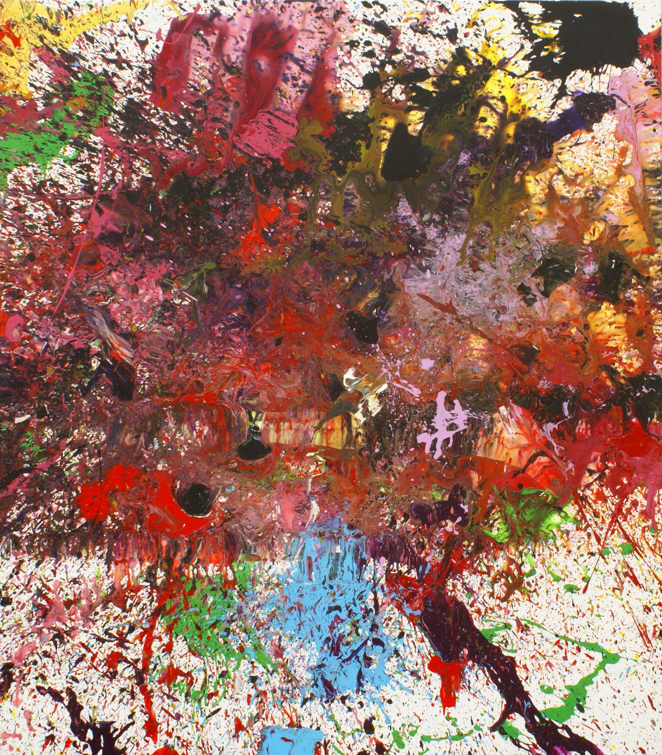 Analogo, e correlato al grafismo del segno-traccia il percorso del segno-colore. Il colore per Shimamoto […] è il mezzo attraverso il quale viene superata la distanza tra lo spazio reale e lo spazio creato. Il colore si muove entro lo stesso schema cinetico e corporeo del segno, in un’economia dove la mente governa la premeditazione, mentre il soma si incarna con il manifestarsi della materia. E tutto avviene all’interno di un’esperienza sempre unica… Il colore coinvolge l’emotività dell’artista trascinandolo da una cinetica implosa e centripeta a uno sconfinamento esploso e centrifugo […]. La materia colorata si fonde e si confonde, in balia di onde d’urto armoniche o dissonanti che spalancano finestre sul mondo con spettacolari deflagrazioni risolte nell’attimo bruciante del loro apparire” (Italo Tomassoni, Shozo Shimamoto. Tra azione e materia, tra Gutai e Art Autre, 2024 ).