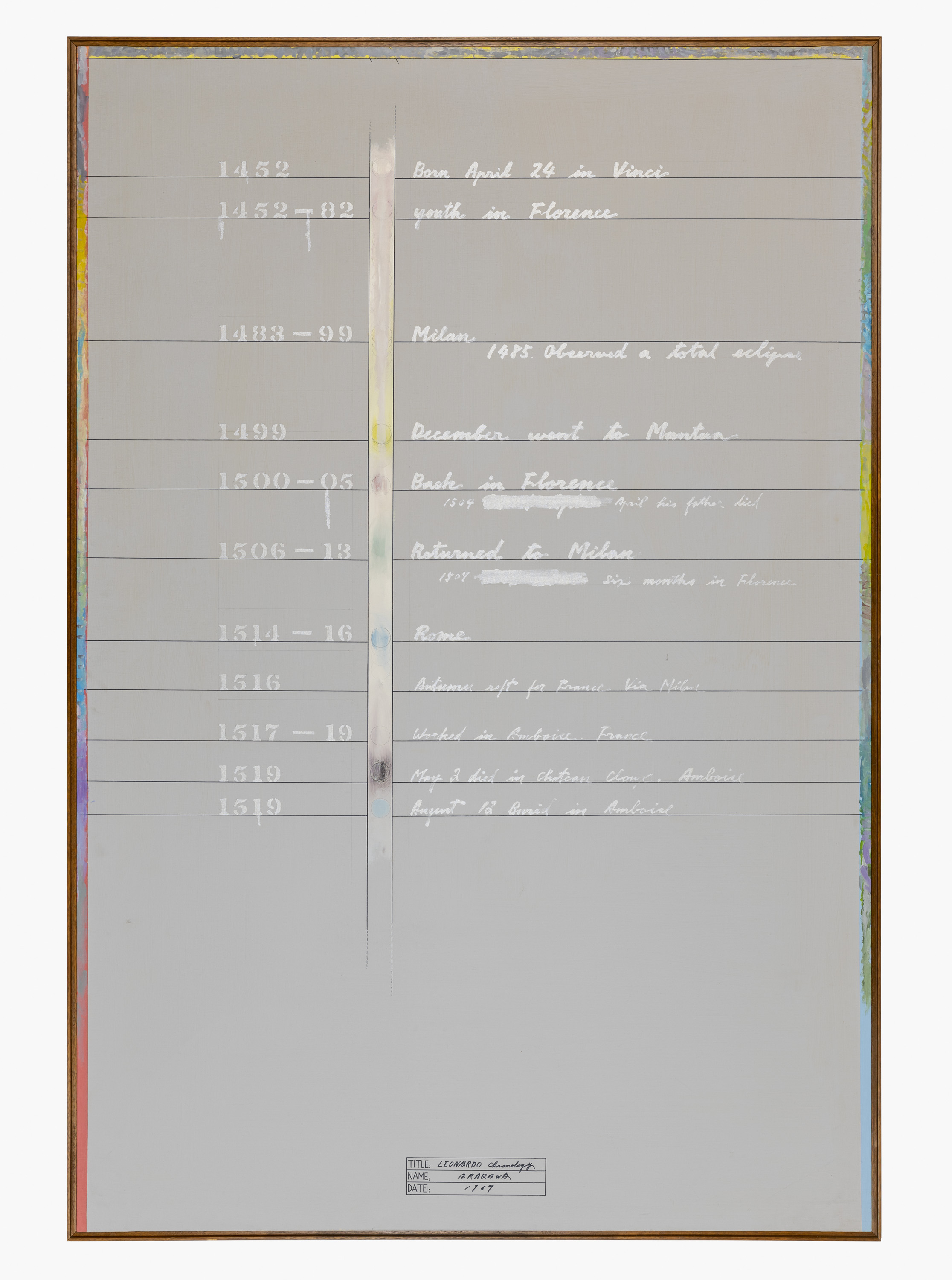significato e la forma di tutto il resto fluttuino attorno a queste lacune dell’esistere”, secondo le parole di Italo Calvino, che apprezzava la sua arte ed ebbe modo di discuterne con lui in diversi incontri, tra Parigi e New York. Per Calvino la pittura di Arakawa, puramente intellettuale, rende visibile “il colore della mente” – da cui il titolo della mostra: “la mente ha un colore che non riusciamo mai a vedere perché c’è sempre qualche altro colore che ci passa per la mente e si sovrappone al nostro sguardo. […] La mente non può avere altro colore che quello dei quadri di Arakawa”.