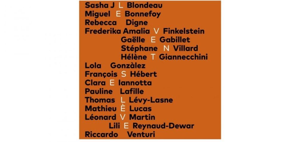 Sasha Blondeau (compositore), Miguel Bonnefoy (scrittore), Rebecca Digne (artista visiva), Amalia Finkelstein (scrittrice), Gaëlle Gabillet e Stéphane Villard – Studio GGSV (designer), Hélène Giannecchini (scrittrice), Lola Gonzàlez (cineasta e artista visiva), François Hébert (cineasta), Clara Iannotta (compositrice), Pauline Lafille (storica dell’arte), Thomas Lévy-Lasne (pittore), Mathieu Lucas (architetto – paesaggista), Léonard Martin (artista visivo), Lili Reynaud-Dewar (artista visiva) e Riccardo Venturi (storico dell’arte).