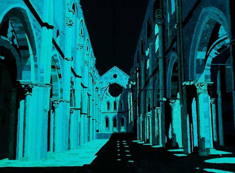 Nella pittura di luce l'interstizio/spiraglio è la nostra commozione, lo stupore e, se vogliamo, anche la paura del passaggio vedo/non vedo o meglio vedo e poi mi accorgo di presenze oltre la luce. “ Il colore non esiste” esclama Raimondo Galeano, artista che bene conosce e studia questa tecnica, “perché in assenza di luce nessuno di sarebbe in grado di distinguerne alcuno”. In effetti, il colore non è una caratteristica fisica ma è una sensazione elaborata dal cervello quando i nostri occhi percepiscono fotoni di una certa lunghezza d'onda. Secondo la fisica, siamo noi essere umani ad avere un determinato sistema visivo, dando una percezione personale del mondo. Ne deriva che il colore è una creazione umana e la vera natura delle cose è il buio. Ogni oggetto in realtà è oscuro e non emette colore di per sé. La luce è sempre alla base di tutto. Così, imprigionando la realtà con la pittura luminescente, ci si apre un mondo sconosciuto dove le sagome prendono vita e si animano d'emozioni e sentimenti che corrono attraverso l'oscurità e rendono percepibile ciò che prima era nascosto.