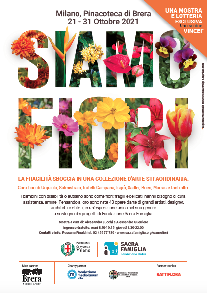 Dal 21 al 31 ottobre 2021 l’Atrio dei Gesuiti della Pinacoteca di Brera di Milano ospiterà le opere del progetto ‘Siamo Fiori’ di Fondazione Sacra Famiglia, realizzate da artisti e designer internazionali tra cui Marras, Isgrò, De Lucchi, Paladino.
