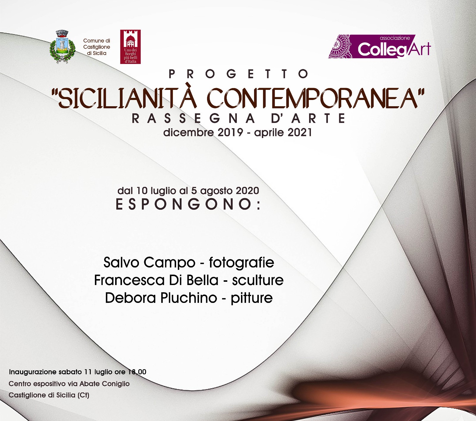 Sabato 11 luglio 2020 alle ore 18,00 nella sede del C.E.M. Centro Espositivo sito in via A. Coniglio a Castiglione di Sicilia si inaugura la mostra d’arte, facente parte della rassegna “Sicilianità Contemporanea“. La mostra, visitabile dall’11 luglio al 5 agosto 2020, offrirà un’eclettica collettiva con le sculture di Francesca Di Bella, le pitture di Debora Pluchino e le fotografie di Salvo Campo.