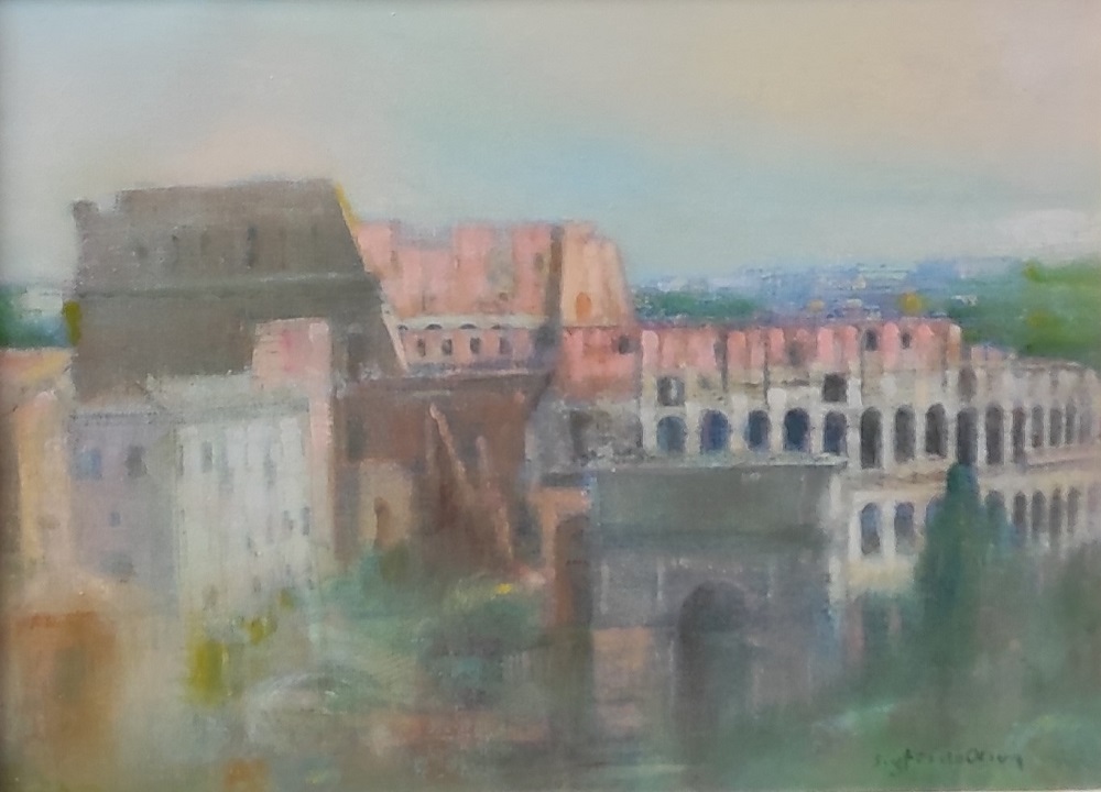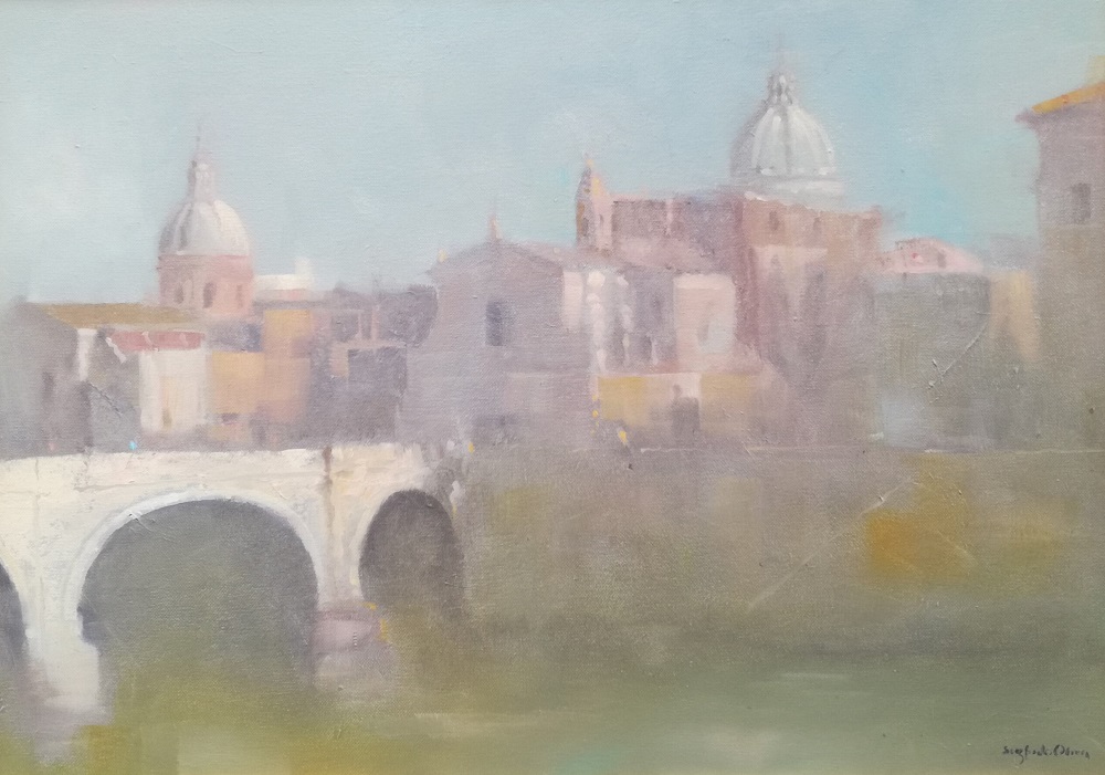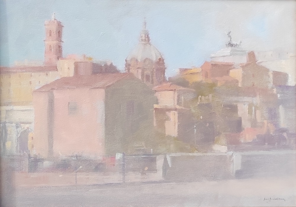 Sigfrido Oliva si trasferisce a Roma nel 1961, dove ancora oggi vive e lavora. Il centro storico della città, con le sue numerose cupole e i suoi impareggiabili scorci, è da sempre fonte illimitata di ispirazione. La mostra, che ripercorre gli ultimi 20 anni di produzione, si compone prevalentemente di paesaggi romani di spiccata unicità e caratterizzati da una tavolozza immediatamente riconoscibile per la sua diafanità. Da qui il proposito di intitolare la mostra “La struttura lieve della memoria”, per descrivere l’ossimoro immanente nelle opere del Maestro, ovvero rappresentare le architetture eterne di Roma riuscendo a conferire leggerezza tramite un uso sapiente della luce.