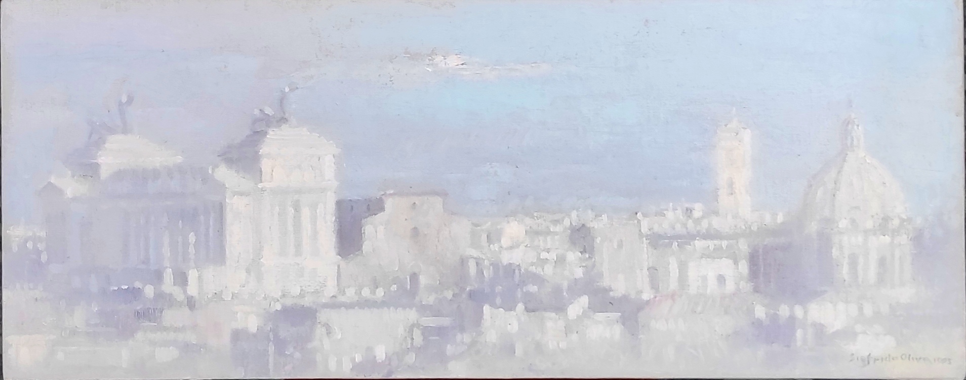 Francesco Ciaffi, nel testo in catalogo, scrive una delle caratteristiche più affascinanti del lavoro di Oliva “è la capacità di trasmettere all’osservatore quella languida suggestione tonale tipica dei suoi scorci, così perfettamente riconoscibili nonostante la totale perdita di confini netti, sciolti nelle morbide campiture cerulee e ammantati di un’aria umida e silente”.