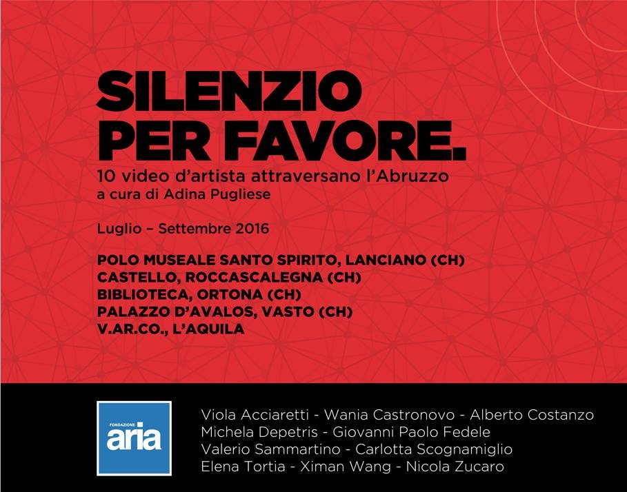 La Fondazione ARIA promuove e organizza la seconda edizione di Silenzio per favore, una rassegna di videoarte che si svolge sul territorio abruzzese e che presenta alcuni tra i più interessanti giovani artisti italiani, la cui ricerca si svolge principalmente in ambito video.