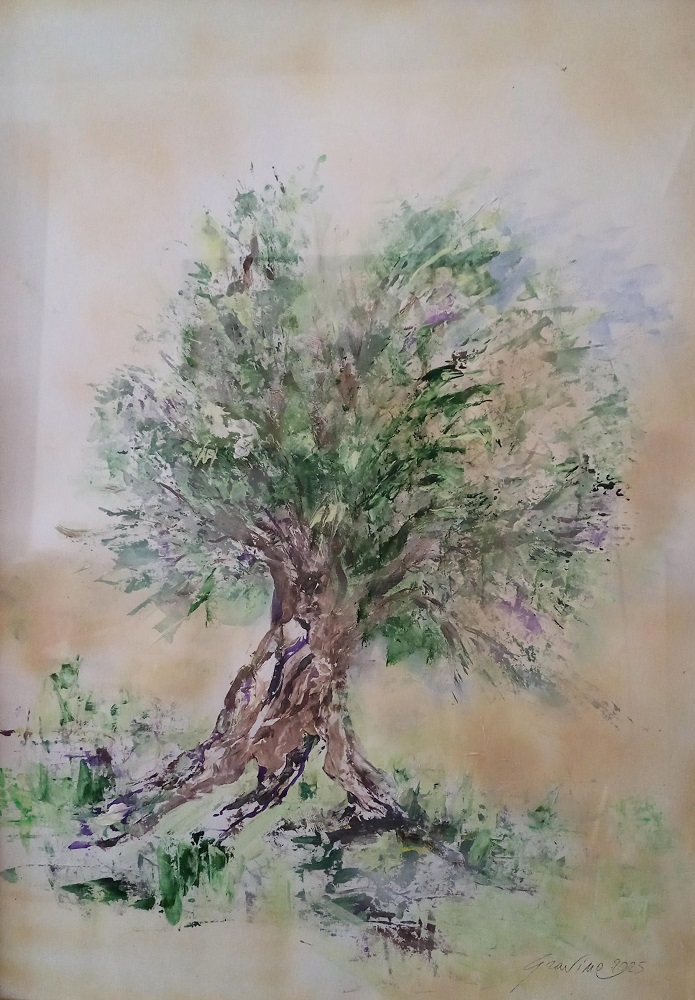 Il percorso espositivo si snoda attraverso opere che amplificano il sussurro degli ulivi, interpretandone il respiro millenario. Le creazioni di Tiziana Befani evocano la sacralità dell’ulivo, sospeso tra materia e trascendenza, mentre Maria Rita Gravina ne cattura la vitalità attraverso acquerelli fluidi e vibranti. Fabio Santoro instaura un dialogo poetico tra l’ulivo e la luna con contrasti luminosi e intensi, le incisioni e i segni di Renata Solimini trasformano le venature del legno in mappe di memoria e Claudio Spada, con la sua pittura materica, restituisce la potenza e l’energia di tronchi scolpiti dal tempo.