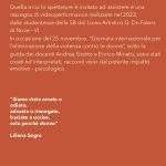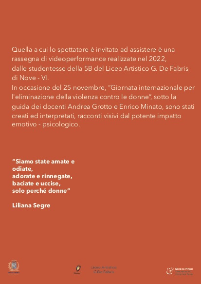 Rassegna di videoperformance realizzate nel 2022, dalle studentesse della 5B del Liceo Artistico G. De Fabris di Nove – VI. Da un’idea di Andrea Grotto e Enrico Minato, sono stati creati e interpretati, video e performance dal potente impatto emotivo – psicologico.