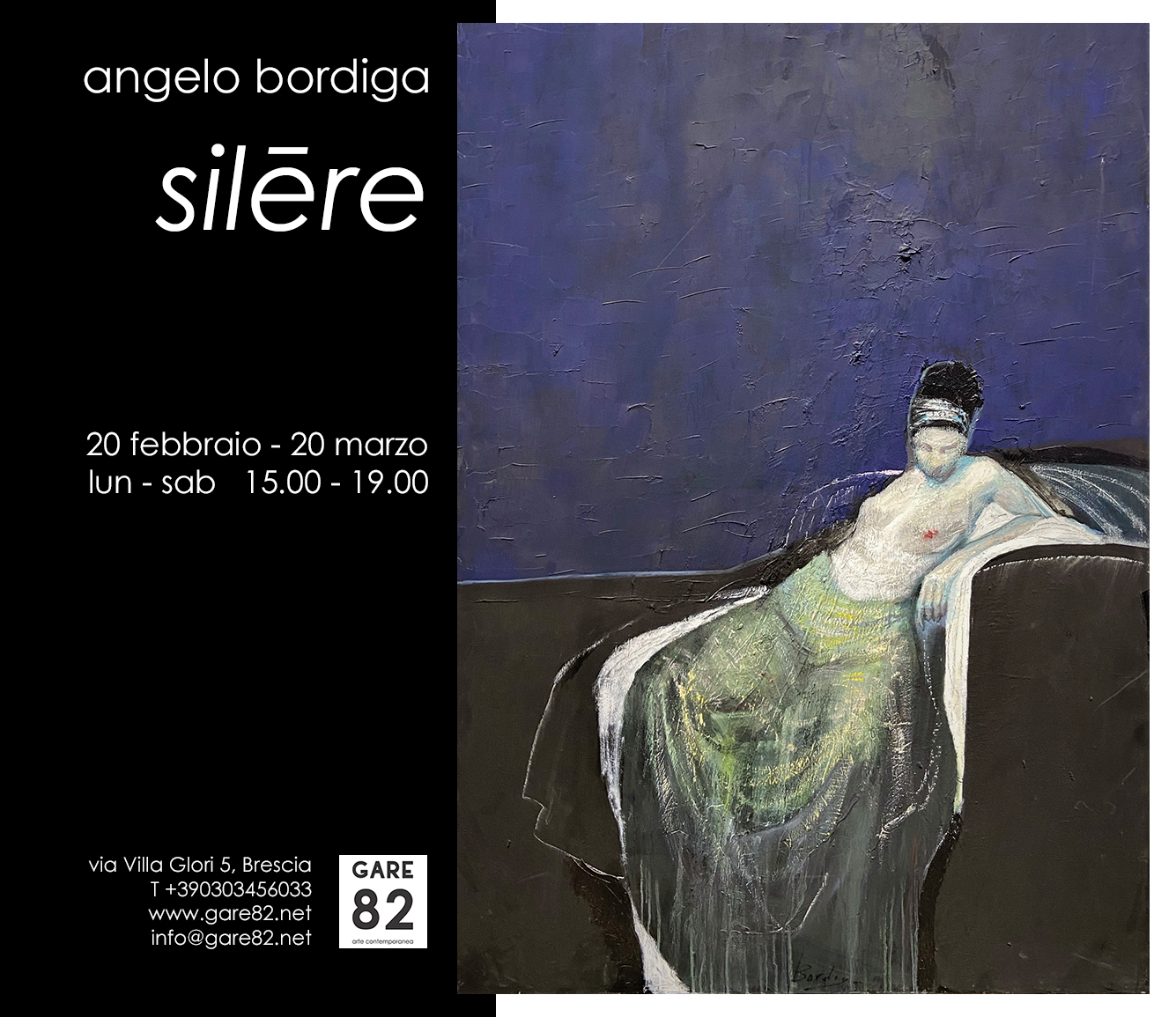 Figure anonime emergono da fondi monocromi stesi con gesti ampi e materici che rendono palpabile l’urgenza del segno, la necessità pittorica con cui Angelo Bordiga interviene sul supporto. Dimensioni prive di narrazione, piene di assenza ed evocativi silenzi. E tacere diventa necessario.