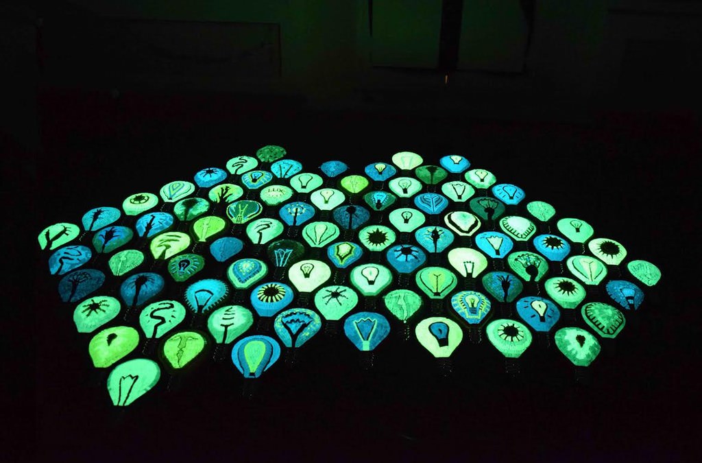 Protagoniste dell’opera 85 lampade a mosaico realizzare su ceramica smaltata a terzo fuoco, pezzi tridimensionali a forma di lampadina alte circa 8 cm.