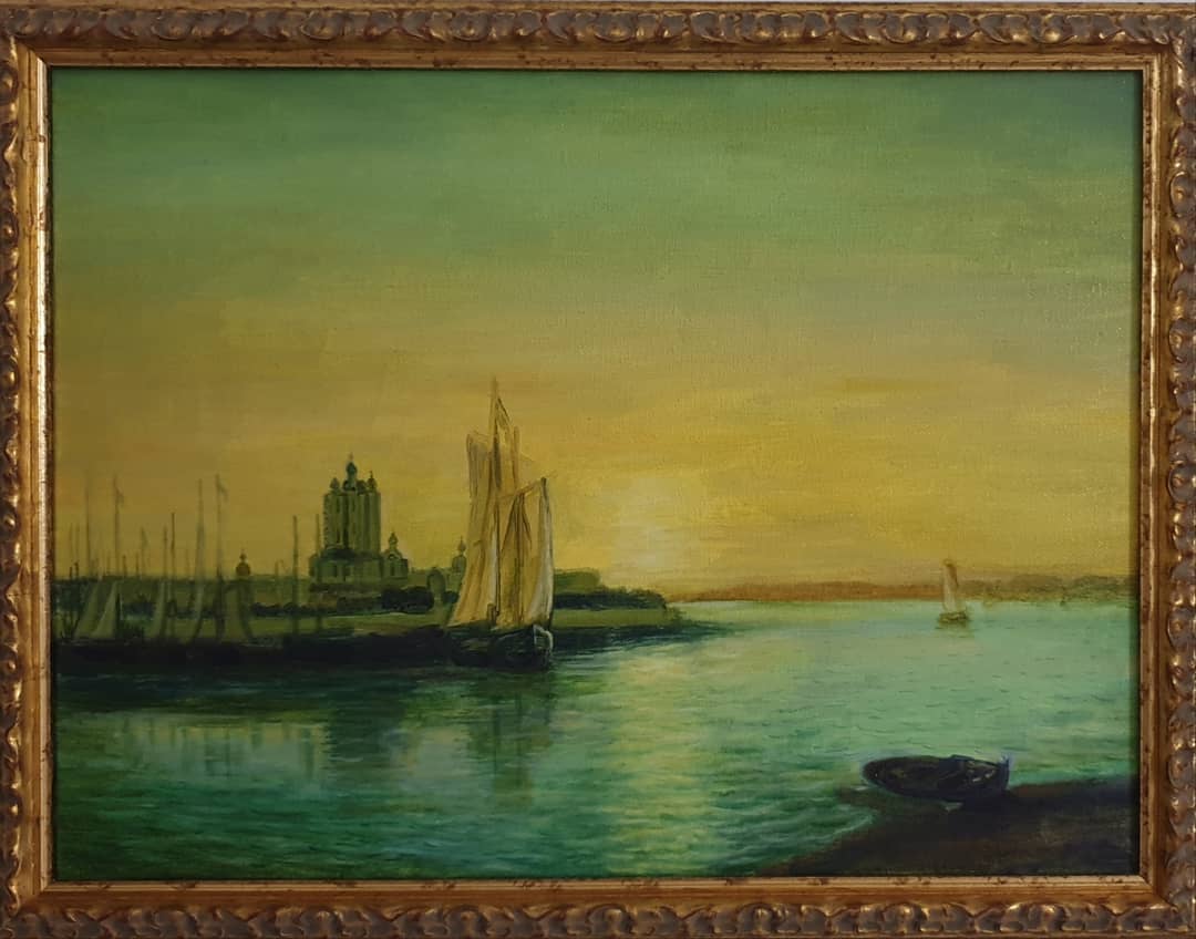 Le brume, che si levano sulle vaste distese, quasi infinite, delle acque del mar Baltico; quel pallore soffuso, mitigato, nel corso dell’anno, soltanto dal “Sole di Mezzanotte” con le sue “notti bianche”, che tanto bene traspone nelle sue opere l’eccelso pittore Ivan Konstantinovic Ajvazovskij, buon amico di William Turner (e nella fedele copia eseguita da Dimitri Kuzmin, una delle opere del romantico maestro armeno – in cui è ritratta una veduta di San Pietroburgo - è esposta in mostra; mentre notiamo che Dimitri Kuzmin – la cui famiglia è originaria di quella città baltica - ha da sempre amato raffigurare vedute e scorci della prediletta Venezia); quella sorta di raccolta, ovattata intimità, che scaturisce dalla simbiosi con l’elemento acquatico, ci sembrano strettamente legate, anzi, persino ci convincono di poter rappresentare il movente primordiale, più vero ed impercettibile, che contribuisce a forgiare un importante aspetto del carattere, che si sostanzia anche quale idem sentire, proprio a non pochi tra coloro che hanno vissuto attorno a quelle sponde nordiche.