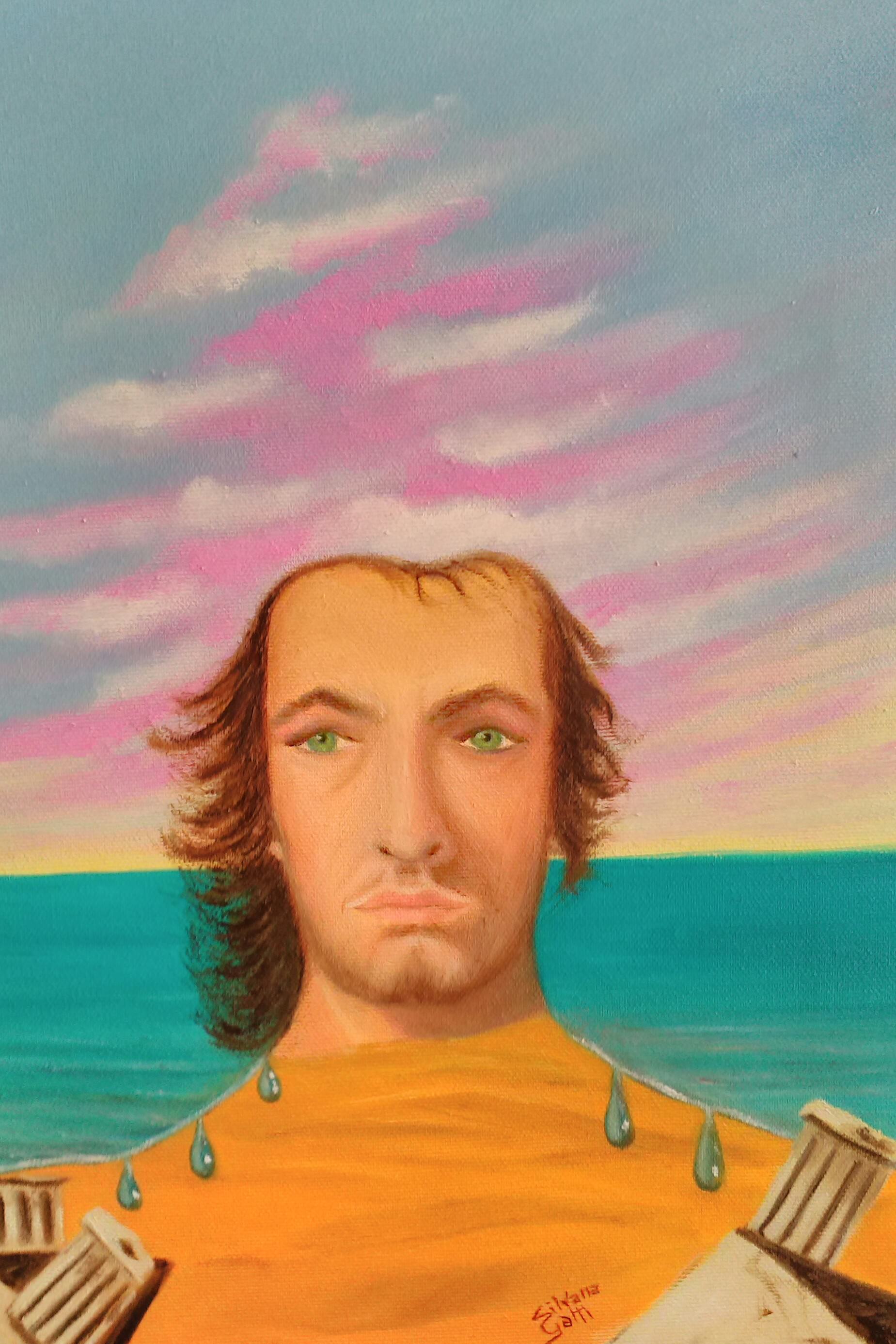 Il simbolo significato dalla tela si mostra peraltro evidente: un giovane uomo, al centro del dipinto, al tramonto, seduto sul bagnasciuga, sulla linea mediana tra l’azzurro del mare ed il rosso del cielo, volto a guardare l’orizzonte, che possiamo immaginare nell’attesa di un nuovo giorno, di un domani di speranza, apportatore di una nuova vita.