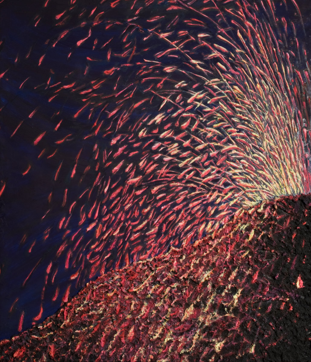 …scorci geomorfologici fortemente ravvicinati ed impreziositi da sprazzi contrapposti di colore, fissati sulla tela con impasti arricchiti dalle sottili sabbie e ceneri vulcaniche.