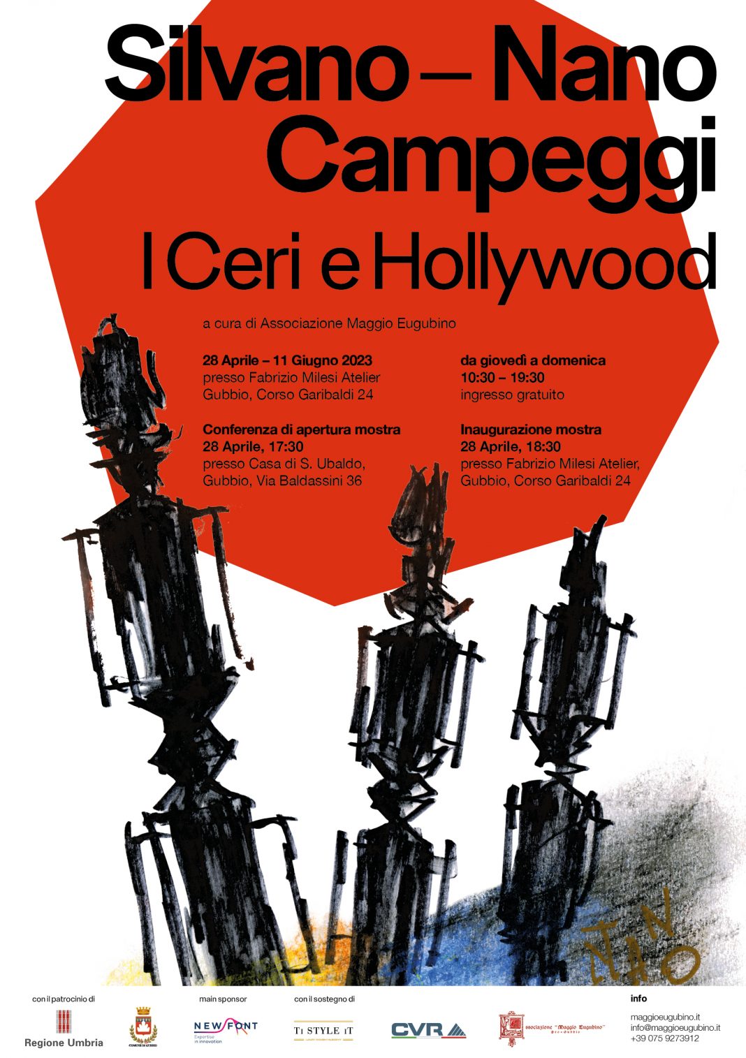 L'attività di Silvano-Nano Campeggi basata su una continua ricerca di stimoli lo porta a maturare interesse per alcune importanti manifestazioni tradizionali che ancora oggi suscitano un profondo coinvolgimento emotivo. La personale capacità di tratto, i colori fiammeggianti uniti ad una notevole forza comunicativa sono i caratteri che possiamo ritrovare anche nei bozzetti su carta che ritraggono la Festa dei Ceri sottolineandone così le suggestioni che lui stesso ha vissuto il 15 maggio 2014 durante la sua visita a Gubbio. Il Maggio Eugubino si è adoperato nell’organizzare la mostra espositiva di arte contemporanea in concomitanza alla Festa dei Ceri 2023. Il progetto di allestimento dell’esposizione e l’ideazione grafica del catalogo sono stati curati dallo studio Fabrizio Milesi. Il volume, nell’insolito formato del diario, ripercorre le 64 opere visibili in mostra, corredate, tra gli altri, dagli scritti dello Storico dell’arte, scrittore, giornalista Mimmo Coletti e del Professore di Storia dell’Arte e Storico dell’arte Roberto Viale. Doveroso presentare, insieme ai disegni legati a Gubbio, una rassegna dei suoi lavori più iconici, per proporre al pubblico il personaggio nella sua completezza, inquadrando il contesto storico, sociale e del costume nel quale è vissuto e ha sviluppato le sue opere più famose esposte in mostra.