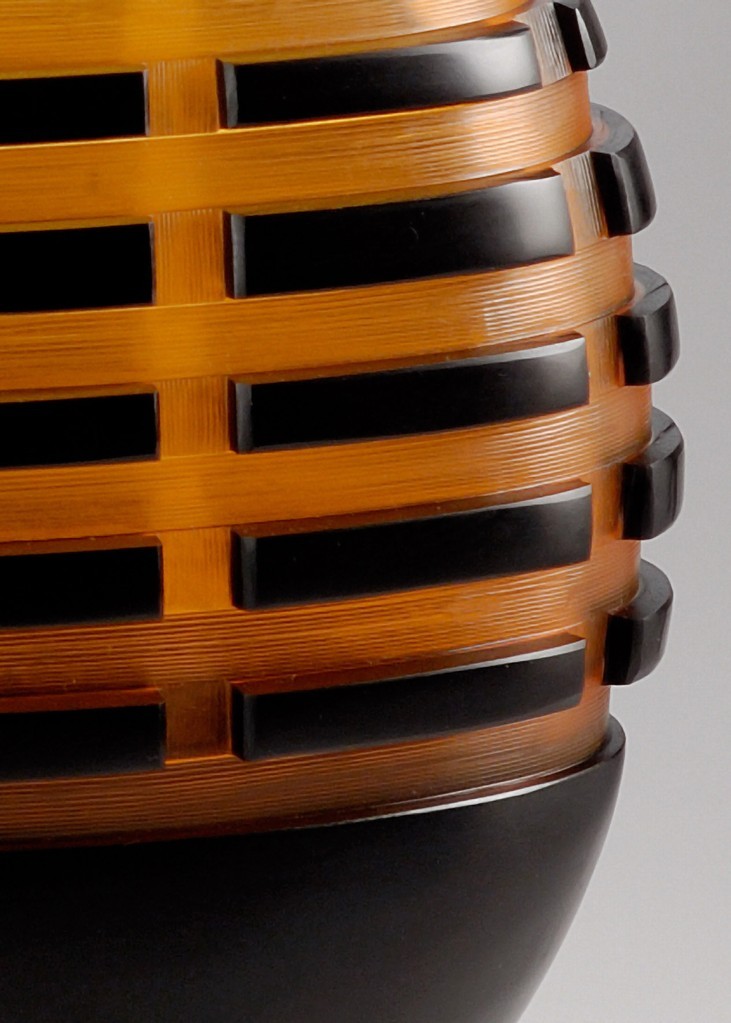 Nel secondo gruppo, le opere di Rubino accentuano l'ambiguità della materia, che è vetro ma potrebbe non esserlo, e si concentra sulla forma. Nei vasi appiattiti la struttura viene sottolineata da un intervento grafico sulla superficie ripartita in zone diversamente colorate, ottenute anch'esse con la molatura dei vari strati vitrei, una molatura però lieve e quasi impercettibile. Il lavoro di scavo talvolta crea l'effetto di un sottile profilo ai margini estremi della struttura”.