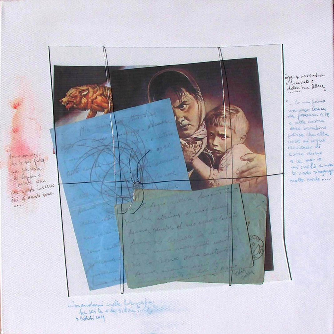 Le lettere non parlano della guerra, sono autocensurate, il mio intendimento è far intravvedere attraverso il montaggio di ritagli di notizie, di immagini da manifesti di propaganda, la guerra e il contrasto, lo stridore con le lettere dove la famiglia, il denaro inviato, la fotografia mai arrivata è oggetto di comunicazione. Il soldato è prigioniero del suo silenzio, della impossibilità di esprimere il tormento, la paura, il dubbio, la violenza, l’assurdità della guerra. Il soldato oggetto della guerra, il soldato oggetto della retorica tuttora. I vetri rotti che coprono le immagini e le lettere sono legati da fili di metallo, perché niente venga dimenticato. Con la trascrizione di alcune frasi ho dato valore a parole, gesti, cose semplici. Con una regressione voluta, cosciente ho tracciato segni e macchie come quando bambina scarabocchiavo le “sue” lettere. L’emozione è stata forte, ma è stata guidata per lasciare la traccia, perché anche altri la seguano per non dimenticare.