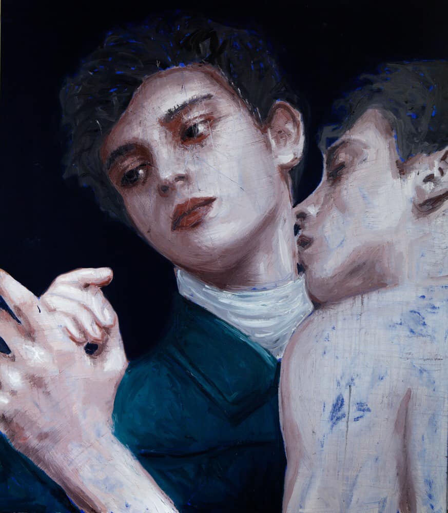 Ma qui siamo nel campo della fotografia. Nella pittura che oggi Silvia ci propone, il minimalismo s'accentua e ci interpella. Cosa ci vuole dire lo sguardo sfregiato della fanciulla incappucciata di rosso? Cosa c'è davvero in quegli occhi umidi e verdi stretti fra capelli e labbra roventi? E nel rapito approccio dei due amanti, prima che la bocca raggiunga il collo proteso e le dita s'intreccino? E in quel sorriso appena accennato, in quelle narici frementi, in quel capezzolo sfrontato che sembrano sfidare l'osservatore?