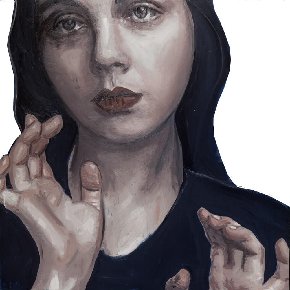 Sullo sfondo soffuso d'una campagna che svanisce in un'ora senza nome, avvolta in un mantello candido, con la sua pelle diafana e lo sguardo che fissa un punto indistinto oltre l'artista – e forse addirittura dentro il suo cervello – si staglia la figura di una giovane donna. Un dolore potrebbe essere acquattato, sotto quelle vesti e quell'epidermide, un'ipnosi potrebbe averla pietrificata, una visione agli altri negata potrebbe averla condotta lì, sulla soglia della nostra illuminazione: qualsiasi evento, qualunque pensiero abbia indotto la creatura a rimanere seduta di fronte a noi, senza vederci e inavvertitamente lasciandosi ammirare, avrà degli strascichi.